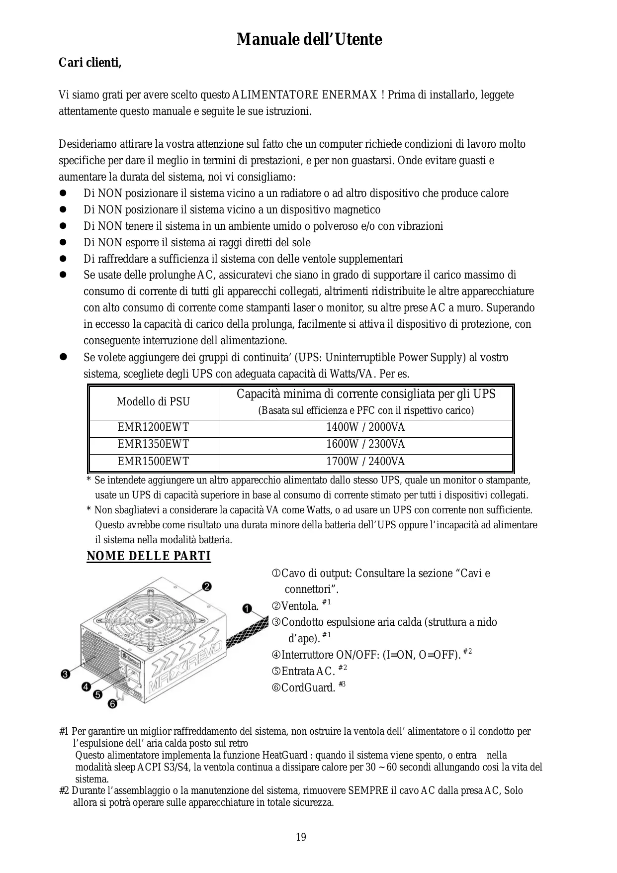 #1 Per garantire un miglior raffreddamento del sistema, non ostruire la ventola dell’ alimentatore o il condotto per l’espulsione dell’ aria calda posto sul retro Questo alimentatore implementa la funzione HeatGuard : quando il sistema viene spento, o entra nella modalità sleep ACPI S3/S4, la ventola continua a dissipare calore per 30 ~ 60 secondi allungando cosi la vita del sistema. #2 Durante l’assemblaggio o la manutenzione del sistema, rimuovere SEMPRE il cavo AC dalla presa AC, Solo allora si potrà operare sulle apparecchiature in totale sicurezza. 19