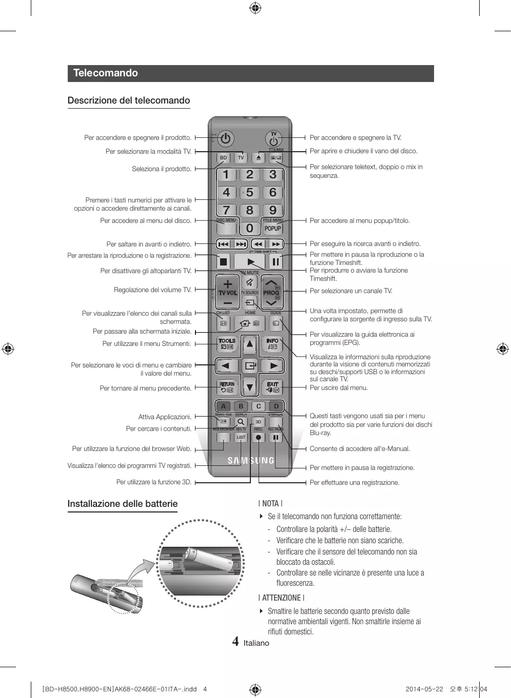 [BD-H8500,H8900-EN]AK68-02466E-01ITA-.indd 4 \\ Smaltire le batterie secondo quanto previsto dalle normative ambientali vigenti. Non smaltirle insieme ai rifiuti domestici. Italiano 2014-05-22 오후 5:12:04 Impostazione del telecomando per il funzionamento con la TV