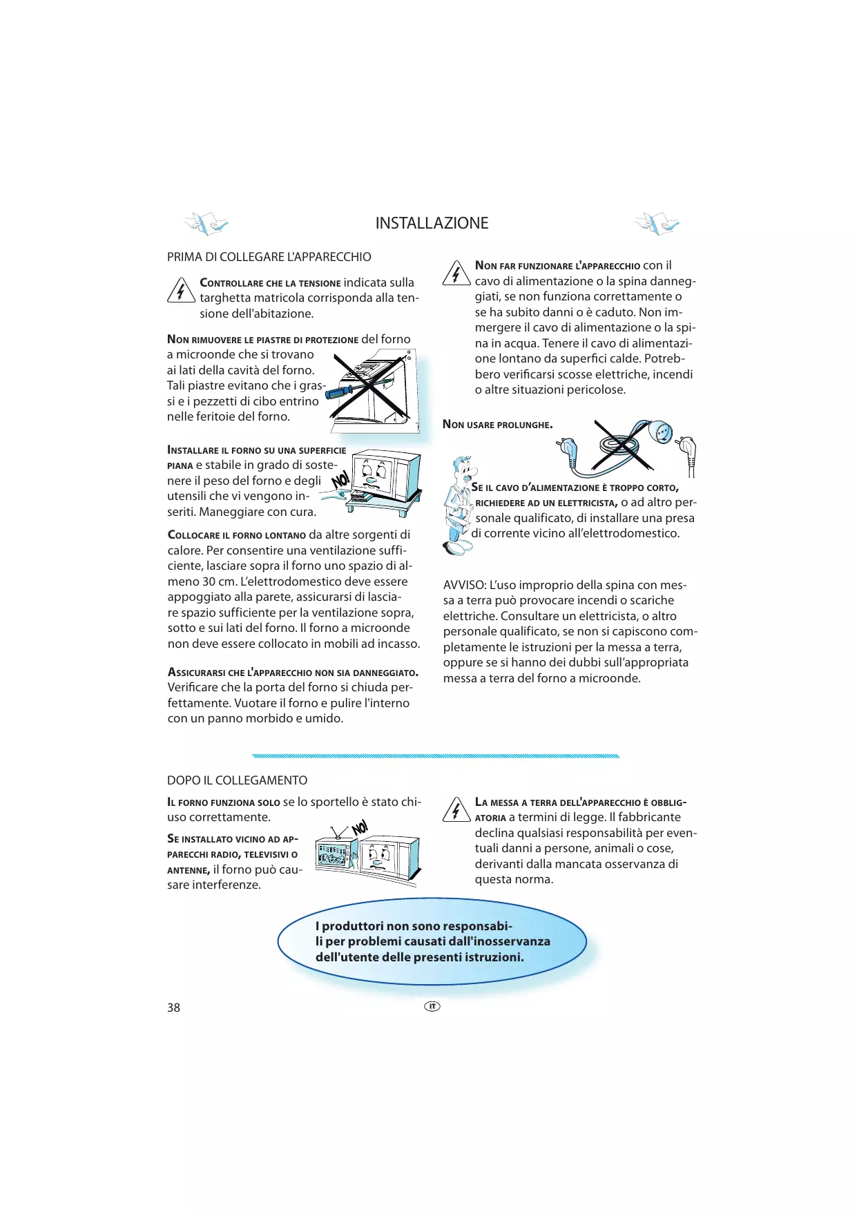 CON LA FUNZIONE MICROONDE INSERITA, questo apparecchio non deve mai essere messo in funzione senza alimenti. in quanto potrebbe subire danni. LE APERTURE DI VENTILAZIONE SUL FORNO non devono essere coperte. L'ostruzione delle aperture di aspirazione o scarico dell'aria può causare danni al forno e compromettere i risultati di cottura. QUANDO SI FANNO PROVE DI PROGRAMMAZIONE, inserire un bicchiere di acqua nel forno. L'acqua assorbirà le microonde e il forno non si rovinerà. NON CONSERVARE O USARE quest'apparecchio all'esterno. NON USARE ILforno vicino a lavandini o su piani d’appoggio bagnati, vicino ad una piscina o simile.