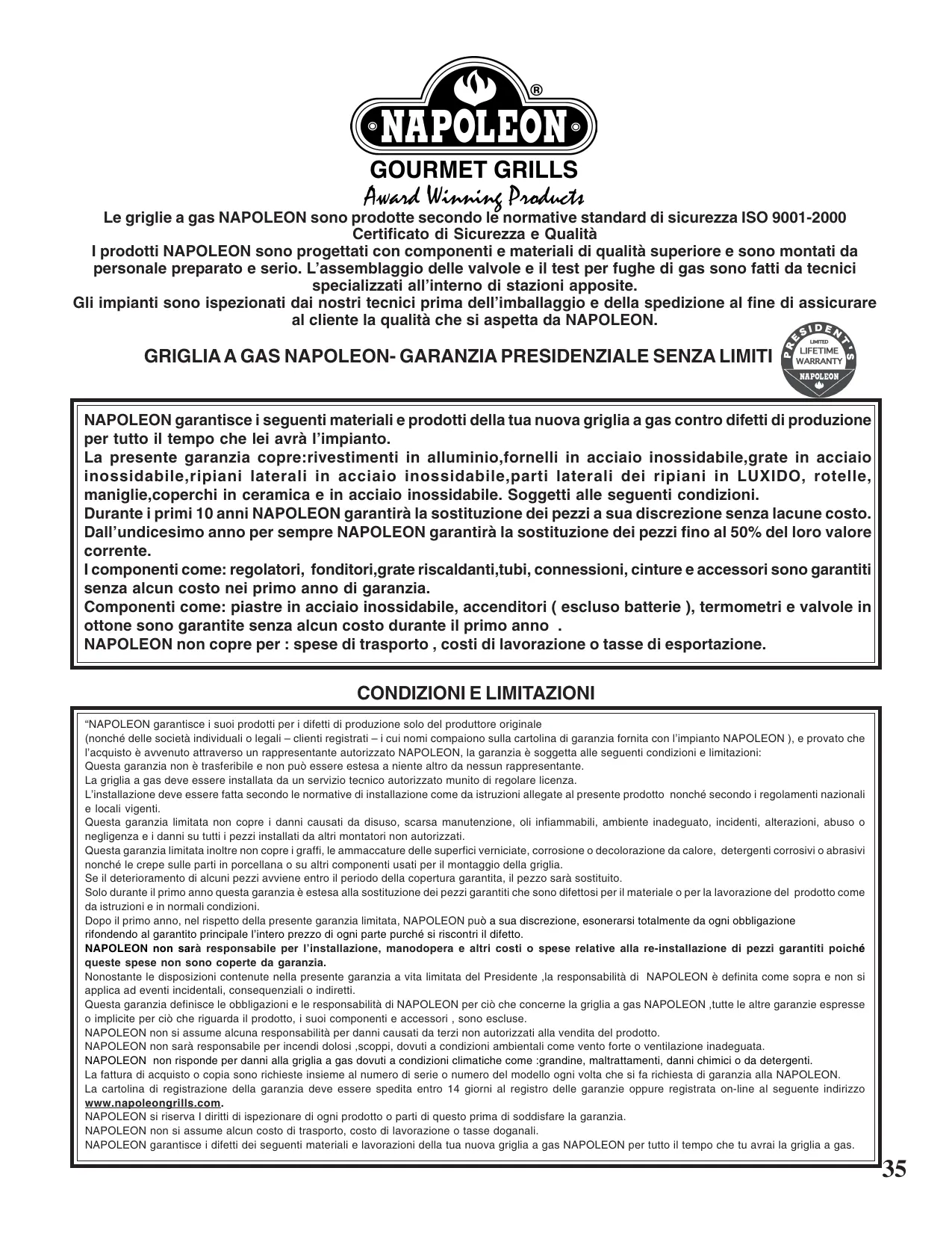 GARANTIE À VIE LIMITÉE DU PRÉSIDENT NAPOLÉON garantit votre nouveau gril à gaz contre tous défauts concernant les matériaux et le procédé de fabrication tels qu’énumérés ci-après tant et aussi longtemps que vous êtes propriétaire du gril. Cette garantie couvre: la fonte d’aluminium, les brûleurs en acier inoxydable, les grilles de cuisson en acier inoxydable (en tige), les tablettes latérales en acier inoxydable, les embout en LUXIDIOR de les tablettes latérales, les roues, les boutons de contrôle, le couvercle de porcelaine émaillée et le couvercle en acier inoxydable sous réserve des conditions suivantes. Pendant les dix premières années, NAPOLÉON remplacera gratuitement les pièces de rechange selon son choix. De la onzième année à vie, NAPOLÉON fournira les pièces de rechange à 50% du prix de détail courant. Les composantes tels que le régulateur, roulettes, la grille-réchaud en acier inoxydable, les tuyaux et les raccords, les fixations et les accessoires sont couverts et NAPOLÉON fournira les pièces gratuitement durant la première année de la garantie limitée. Les composantes tels que les plaques de brûleur en acier inoxydable, l’allumeur exclure les pile, la jauge de température et les soupapes de laiton sont couverts et NAPOLÉON fournira les pièces gratuitement durant les trois premières années de la garantie limitée. NAPOLÉON n’assumera aucun frais de transport, de main-d’oeuvre ou taxes d’exportation.