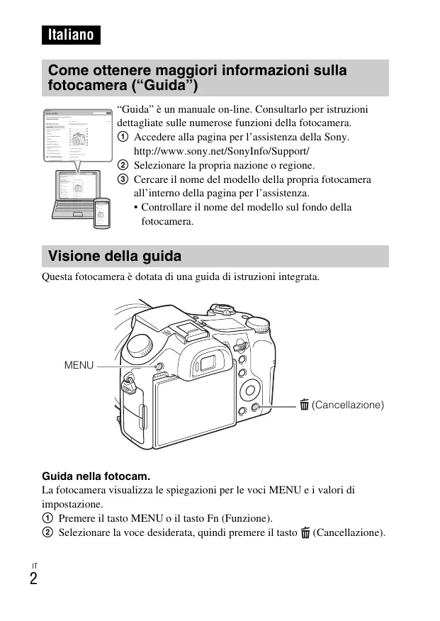 • Controllare il nome del modello sul fondo della fotocamera. Visione della guida Questa fotocamera è dotata di una guida di istruzioni integrata. MENU (Cancellazione) Guida nella fotocam. La fotocamera visualizza le spiegazioni per le voci MENU e i valori di impostazione. 1 Premere il tasto MENU o il tasto Fn (Funzione). 2 Selezionare la voce desiderata, quindi premere il tasto (Cancellazione).