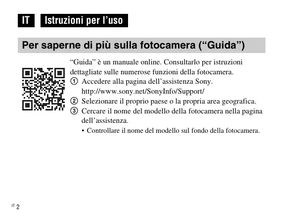 Istruzioni per l’uso Per saperne di più sulla fotocamera (“Guida”) “Guida” è un manuale online. Consultarlo per istruzioni dettagliate sulle numerose funzioni della fotocamera. 1 Accedere alla pagina dell’assistenza Sony. http://www.sony.net/SonyInfo/Support/ 2 Selezionare il proprio paese o la propria area geografica. 3 Cercare il nome del modello della fotocamera nella pagina dell’assistenza.