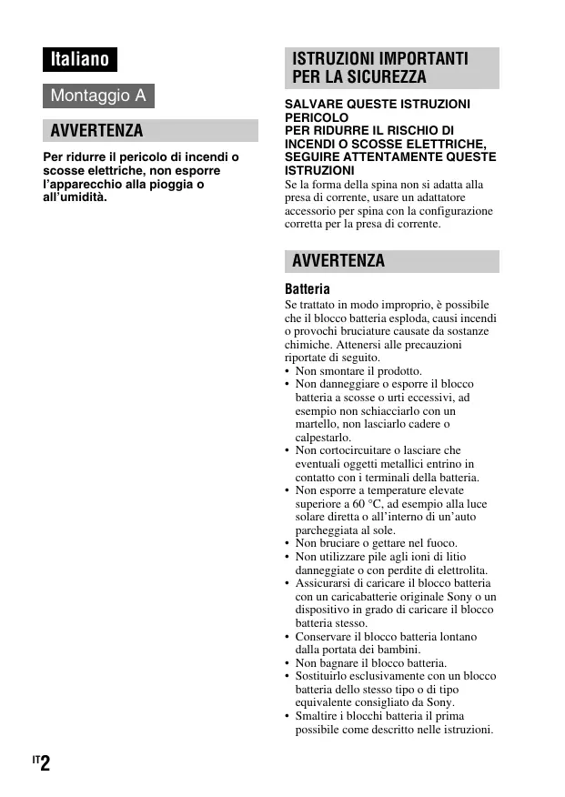 ISTRUZIONI Se la forma della spina non si adatta alla presa di corrente, usare un adattatore accessorio per spina con la configurazione corretta per la presa di corrente. AVVERTENZA Batteria Se trattato in modo improprio, è possibile che il blocco batteria esploda, causi incendi o provochi bruciature causate da sostanze chimiche. Attenersi alle precauzioni riportate di seguito.