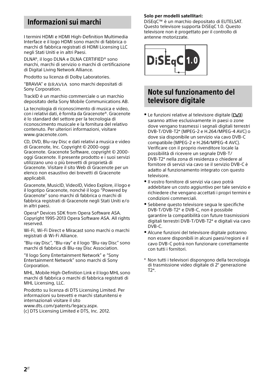 As imagens e ilustrações utilizadas no Guia de Iniciação Rápida, no Guia de referênciae nas Informações de segurança destinam-se a ser utilizadas apenas como referência e podem ser diferentes do produto real. O “x” que aparece no nome do modelo corresponde a um dígito numérico relacionado com o design, a cor ou o sistema de televisão. Não retire o cartão fictício da ranhura CAM do televisor (Módulo de Acesso Condicional), exceto quando for para introduzir um smart card instalado no CAM. A disponibilidade dos acessórios opcionais depende dos países/região/modelo de televisor/ stock. O design e as características técnicas estão sujeitos a alteração sem aviso prévio. 6PT Informazioni sui marchi I termini HDMI e HDMI High-Definition Multimedia Interface e il logo HDMI sono marchi di fabbrica o marchi di fabbrica registrati di HDMI Licensing LLC negli Stati Uniti e in altri Paesi. Solo per modelli satellitari: DiSEqC™ è un marchio depositato di EUTELSAT. Questo televisore supporta DiSEqC 1.0. Questo televisore non è progettato per il controllo di antenne motorizzate. DLNA®, il logo DLNA e DLNA CERTIFIED® sono marchi, marchi di servizio o marchi di certificazione di Digital Living Network Alliance. Prodotto su licenza di Dolby Laboratories. “BRAVIA” e Sony Corporation. sono marchi depositati di TrackID è un marchio commerciale o un marchio depositato della Sony Mobile Communications AB. La tecnologia di riconoscimento di musica e video, con i relativi dati, è fornita da Gracenote®. Gracenote è lo standard del settore per la tecnologia di riconoscimento musicale e la fornitura del relativo contenuto. Per ulteriori informazioni, visitare www.gracenote.com. CD, DVD, Blu-ray Disc e dati relativi a musica e video di Gracenote, Inc. Copyright © 2000-oggi Gracenote. Gracenote Software, copyright © 2000oggi Gracenote. Il presente prodotto e i suoi servizi utilizzano uno o più brevetti di proprietà di Gracenote. Visitare il sito Web di Gracenote per un elenco non esaustivo dei brevetti di Gracenote applicabili. Gracenote, MusicID, VideoID, Video Explore, il logo e il logotipo Gracenote, nonché il logo “Powered by Gracenote” sono marchi di fabbrica o marchi di fabbrica registrati di Gracenote negli Stati Uniti e/o in altri paesi. Opera® Devices SDK from Opera Software ASA. Copyright 1995-2013 Opera Software ASA. All rights reserved. Wi-Fi, Wi-Fi Direct e Miracast sono marchi o marchi registrati di Wi-Fi Alliance. “Blu-ray Disc”, “Blu-ray” e il logo “Blu-ray Disc” sono marchi di fabbrica di Blu-ray Disc Association. “Il logo Sony Entertainment Network” e “Sony Entertainment Network” sono marchi di Sony Corporation. MHL, Mobile High-Definition Link e il logo MHL sono marchi di fabbrica o marchi di fabbrica registrati di MHL Licensing, LLC. Prodotto su licenza di DTS Licensing Limited. Per informazioni su brevetti e marchi statunitensi e internazionali visitare il sito www.dts.com/patents/legacy.aspx. (c) DTS Licensing Limited e DTS, Inc. 2012. 2IT Note sul funzionamento del televisore digitale Le funzioni relative al televisore digitale ( saranno attive esclusivamente in paesi o zone dove vengano trasmessi i segnali digitali terrestri DVB-T/DVB-T2* (MPEG-2 e H.264/MPEG-4 AVC) o dove sia disponibile un servizio via cavo DVB-C compatibile (MPEG-2 e H.264/MPEG-4 AVC). Verificare con il proprio rivenditore locale la possibilità di ricevere un segnale DVB-T/ DVB-T2* nella zona di residenza o chiedere al fornitore di servizi via cavo se il servizio DVB-C è adatto al funzionamento integrato con questo televisore. Il vostro fornitore di servizi via cavo potrà addebitare un costo aggiuntivo per tale servizio e richiedere che vengano accettati i propri termini e condizioni commerciali. Sebbene questo televisore segua le specifiche DVB-T/DVB-T2* e DVB-C, non è possibile garantire la compatibilità con future trasmissioni digitali terrestri DVB-T/DVB-T2* e digitali via cavo DVB-C. Alcune funzioni del televisore digitale potranno non essere disponibili in alcuni paesi/regioni e il cavo DVB-C potrà non funzionare correttamente con tutti i fornitori.