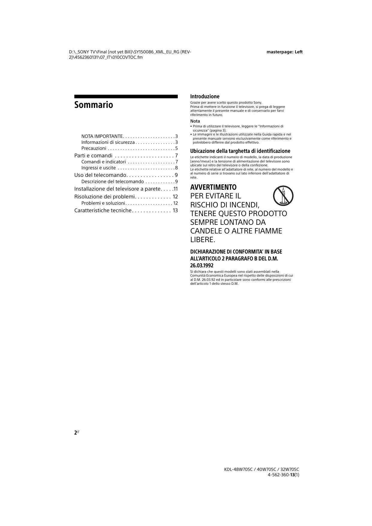 - Alcuni televisori potrebbero comunque disporre di funzioni che per operare correttamente richiedono di lasciare il televisore in standby. 4IT KDL-48W705C / 40W705C / 32W705C 4-562-360-13(1) D:\_SONY TV\Final (not yet Bill)\SY150086_XML_EU_RG (REV2)\4562360131\07_IT\010COVTOC.fm Bambini