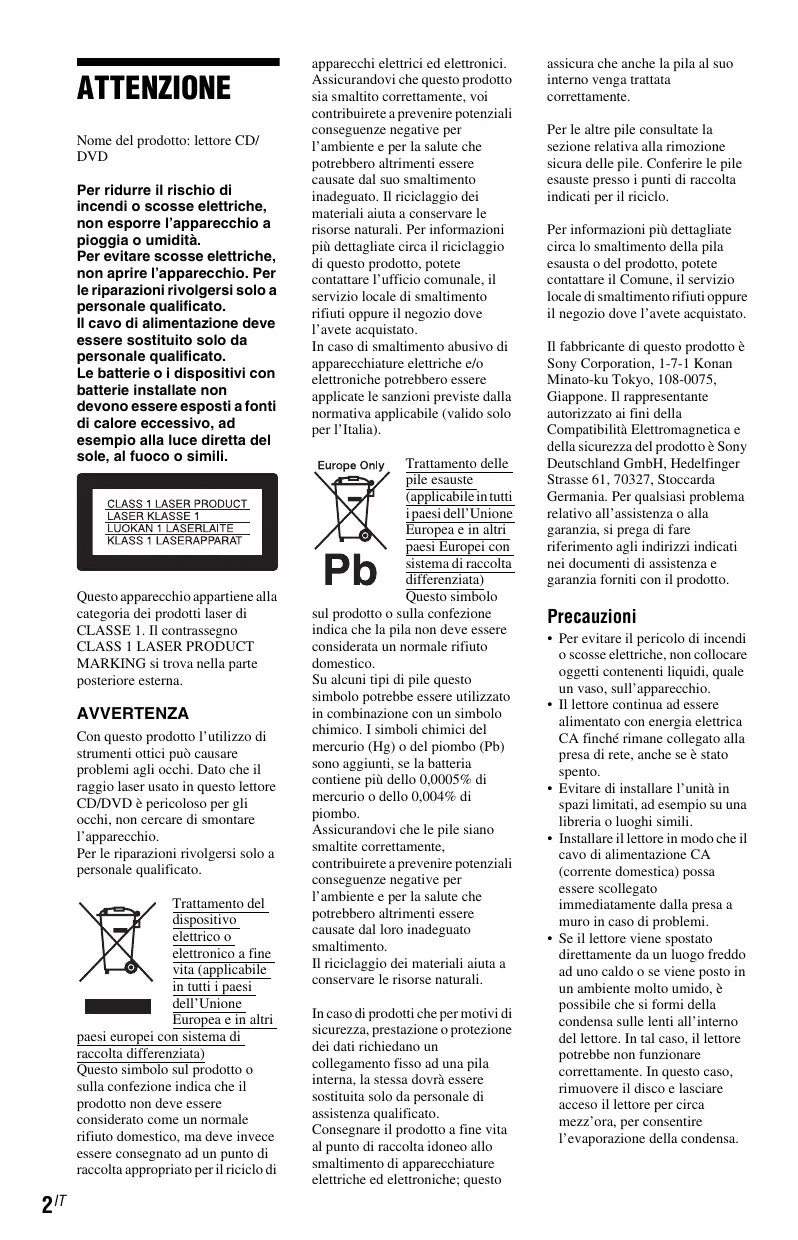Para las demás baterías, consulte la sección donde se indica cómo extraer la batería del producto de forma segura. Deposite la batería en el correspondiente punto de recogida para el reciclado de baterías. Para recibir información detallada sobre el reciclaje de este producto o de la batería, póngase en contacto con el ayuntamiento, el punto de recogida más cercano o el establecimiento donde ha adquirido el producto. El fabricante de este producto es Sony Corporation, 1-7-1 Konan Minato-ku Tokyo, 108-0075 CA pueda ser desenchufado de la toma de corriente de la pared inmediatamente en caso de problema. • Si traslada el reproductor directamente de un lugar frío a uno cálido o si lo instala en una sala muy húmeda, es posible que se condense humedad en las lentes de su interior. Si esto ocurre, es posible que el reproductor no funcione correctamente. En este caso, extraiga el disco y deje encendido el reproductor durante