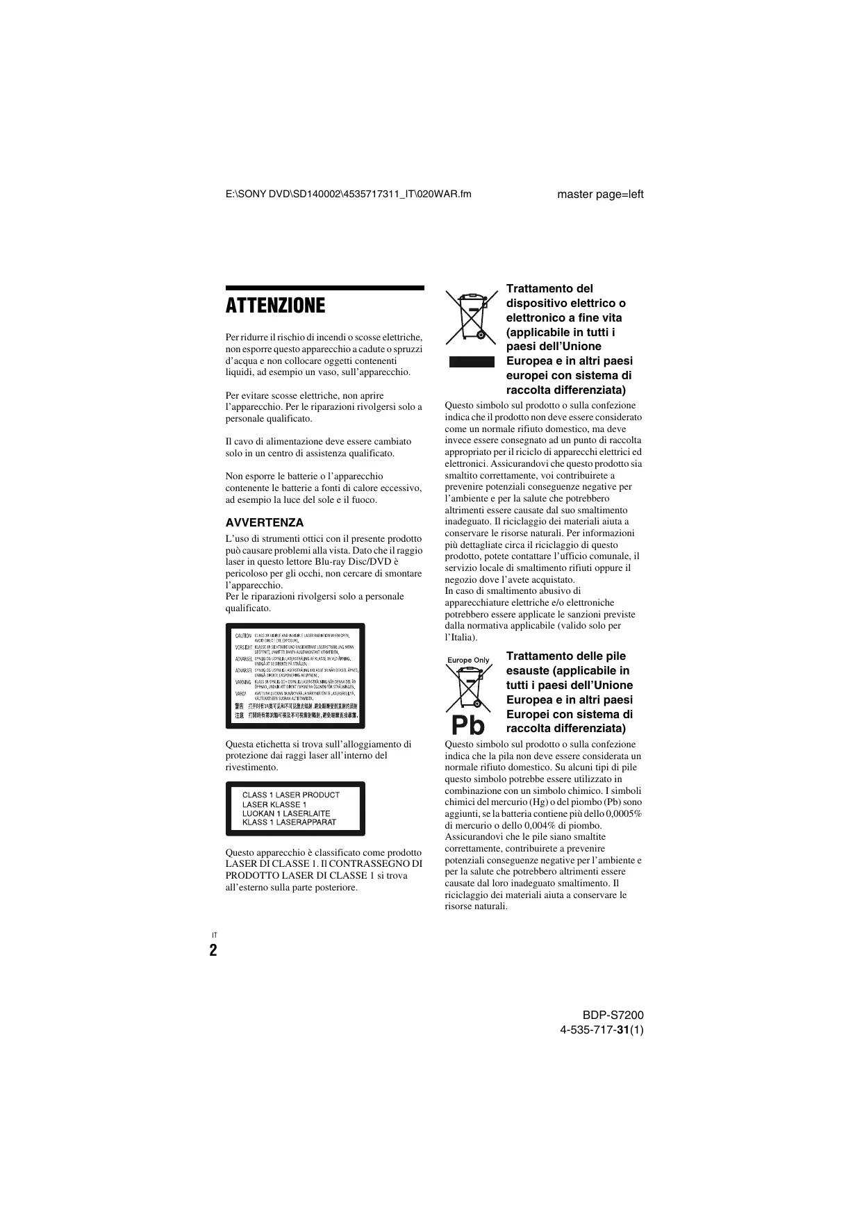 PRODOTTO LASER DI CLASSE 1 si trova all'esterno sulla parte posteriore. master page=left Trattamento del dispositivo elettrico o paesi dell'Unione Europea e in altri paesi europei con sistema di raccolta differenziata) Questo simbolo sul prodotto o sulla confezione indica che il prodotto non deve essere considerato come un normale rifiuto domestico, ma deve invece essere consegnato ad un punto di raccolta appropriato per il riciclo di apparecchi elettrici ed elettronici. Assicurandovi che questo prodotto sia smaltito correttamente, voi contribuirete a prevenire potenziali conseguenze negative per l'ambiente e per la salute che potrebbero altrimenti essere causate dal suo smaltimento inadeguato. I riciclaggio dei materiali aiuta a conservare le risorse naturali. Per informazioni più dettagliate circa il riciclaggio di questo prodotto, potete contattare l’ufficio comunale, il servizio locale di smaltimento rifiuti oppure il negozio dove l'avete acquistato. In caso di smaltimento abusivo di apparecchiature elettriche e/o elettroniche potrebbero essere applicate le sanzioni previste dalla normativa applicabile (valido solo per Italia) Trattamento delle pile esauste (applicabile in tutti i paesi dell’Unione Europea e in altri paesi Europei con sistema di Ph raccoita aifferenziata) Questo simbolo sul prodotto o sulla confezione indica che la pila non deve essere considerata un normale rifiuto domestic. Su alcuni tipi di pile questo simbolo potrebbe essere utilizzato in combinazione con un simbolo chimico. 1 simboli chimici del mercurio (Hg) o del piombo (Pb) sono aggiunti, se la batteria contiene più dello 0,0005% di mereurio o dello 0,004% di piombo. Assicurandovi che le pile siano smaltite correttamente, contribuirete a prevenire potenziali conseguenze negative per l'ambiente € per la salute che potrebbero altrimenti essere causate dal loro inadeguato smaltimento. 11 riciclaggio dei materiali aiuta a conservare le risorse natural Europe Only BDP-S7200 4-585-717-31(1)