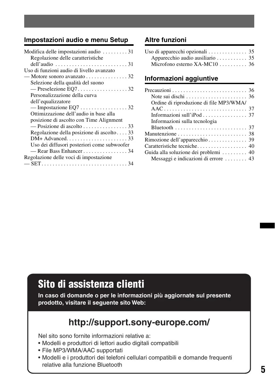 Guida rapida all’uso della funzione Bluetooth Per informazioni dettagliate, vedere “Bluetooth (Chiamate vivavoce e streaming musicale)” (pagina 25) e consultare le istruzioni per l’uso del dispositivo Bluetooth. 3 fasi per utilizzare la funzione Bluetooth 1 Associazione Per prima cosa è necessario registrare (“associare”) il dispositivo Bluetooth (telefono cellulare, ecc.) sul presente apparecchio. Questa operazione, detta “associazione”, deve essere effettuata solo la prima volta. 2 Connessione Dopo aver effettuato l’associazione, è necessario attivare la connessione tra il presente apparecchio e il dispositivo Bluetooth. A seconda del dispositivo, la connessione potrebbe essere attivata automaticamente durante l’associazione. 3 Chiamate vivavoce/streaming musicale Con questo apparecchio è possibile effettuare/ricevere chiamate in vivavoce e ascoltare contenuti audio. Sito di assistenza clienti http://support.sony-europe.com/
