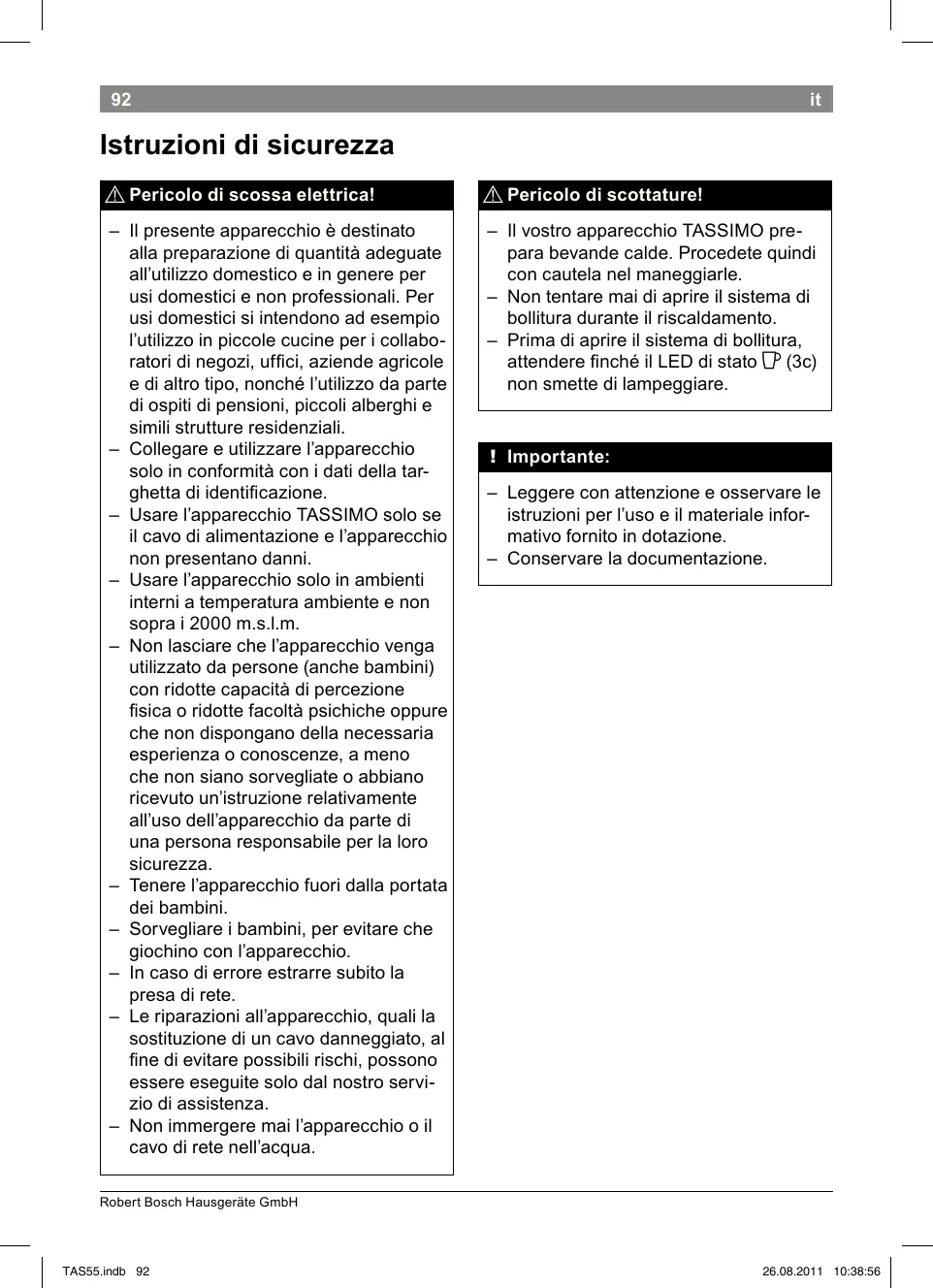 Istruzioni!di!sicurezza ¡ Pericolo!di!scossa!elettrica! ¡ Pericolo!di!scottature! – Il presente apparecchio è destinato alla preparazione di quantità adeguate all’utilizzo domestico e in genere per usi domestici e non professionali. Per usi domestici si intendono ad esempio l’utilizzo in piccole cucine per i collabo ratori di negozi, ufici, aziende agricole e di altro tipo, nonché l’utilizzo da parte di ospiti di pensioni, piccoli alberghi e simili strutture residenziali. – Collegare e utilizzare l’apparecchio solo in conformità con i dati della tar ghetta di identiicazione. – Usare l’apparecchio TASSIMO solo se il cavo di alimentazione e l’apparecchio non presentano danni. – Usare l’apparecchio solo in ambienti interni a temperatura ambiente e non sopra i 2000 m.s.l.m. – Non lasciare che l’apparecchio venga utilizzato da persone (anche bambini) con ridotte capacità di percezione isica o ridotte facoltà psichiche oppure che non dispongano della necessaria esperienza o conoscenze, a meno che non siano sorvegliate o abbiano ricevuto un’istruzione relativamente all’uso dell’apparecchio da parte di una persona responsabile per la loro sicurezza. – Tenere l’apparecchio fuori dalla portata dei bambini. – Sorvegliare i bambini, per evitare che giochino con l’apparecchio. – In caso di errore estrarre subito la presa di rete. – Le riparazioni all’apparecchio, quali la sostituzione di un cavo danneggiato, al ine di evitare possibili rischi, possono essere eseguite solo dal nostro servi zio di assistenza. – Non immergere mai l’apparecchio o il cavo di rete nell’acqua. – Il vostro apparecchio TASSIMO pre para bevande calde. Procedete quindi con cautela nel maneggiarle. – Non tentare mai di aprire il sistema di bollitura durante il riscaldamento. – Prima di aprire il sistema di bollitura, attendere inché il LED di stato F (3c) non smette di lampeggiare. !! Importante: – Leggere con attenzione e osservare le istruzioni per l’uso e il materiale infor mativo fornito in dotazione. – Conservare la documentazione. Robert Bosch Hausgeräte GmbH TAS55.indb 92