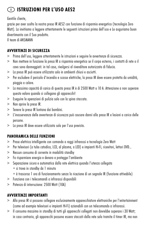 > Prima dell’uso, leggere attentamente le istruzioni e seguire le avvertenze di sicurezza. > Non mettere in funzione la presa IR a risparmio energetico se il corpo esterno, i contatti di rete o il cavo sono danneggiati: in tal caso, rivolgersi al rivenditore autorizzato di fiducia. > La presa IR può essere utilizzata solo in ambienti chiusi e asciutti. > Per escludere il pericolo d’incendio e scosse elettriche, la presa IR deve essere protetta da umidità, pioggia e calore. > La massima capacità di carico di questa presa IR è di 2500 Watt o 10 A. Attenzione a non superare questo valore quando si collegano gli apparecchi! > Eseguire le operazioni di pulizia solo con la spina staccata. > Non aprire la presa IR. > Tenere la presa IR lontana dai bambini. > L’inosservanza delle avvertenze di sicurezza può causare danni alla presa IR e lesioni a carico delle persone. > La presa IR deve essere utilizzata solo per l’uso previsto.