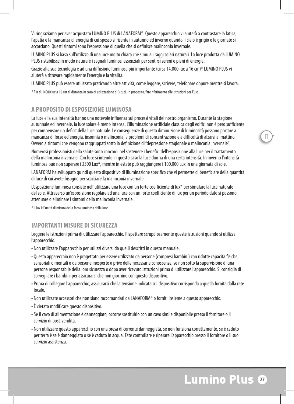 Vi ringraziamo per aver acquistato LUMINO PLUS di LANAFORM®. Questo apparecchio vi aiuterà a contrastare la fatica, l’apatia e la mancanza di energia di cui spesso si risente in autunno ed inverno quando il cielo è grigio e le giornate si accorciano. Questi sintomi sono l’espressione di quella che si definisce malinconia invernale. LUMINO PLUS si basa sull’utilizzo di una luce molto chiara che simula i raggi solari naturali. La luce prodotta da LUMINO PLUS ristabilisce in modo naturale i segnali luminosi essenziali per sentirsi sereni e pieni di energia. Grazie alla sua tecnologia e ad una diffusione luminosa più importante (circa 14.000 lux a 16 cm)* LUMINO PLUS vi aiuterà a ritrovare rapidamente l’energia e la vitalità. LUMINO PLUS può essere utilizzato praticando altre attività, come leggere, scrivere, telefonare oppure mentre si lavora. * Più di 14000 lux a 16 cm di distanza in caso di utilizzazione di 3 tubi. In proposito, fare riferimento alle istruzioni per l’uso.