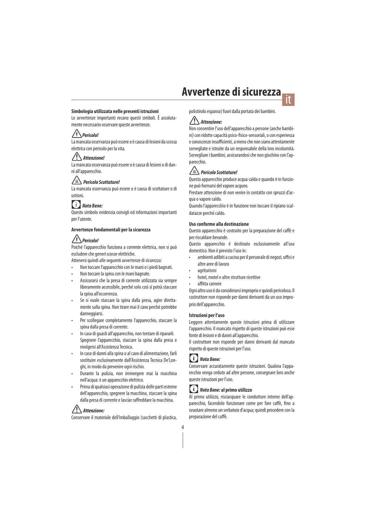 polistirolo espanso) fuori dalla portata dei bambini. Attenzione: Non consentire l’uso dell’apparecchio a persone (anche bambini) con ridotte capacità psico-fisico-sensoriali, o con esperienza e conoscenze insufficienti, a meno che non siano attentamente sorvegliate e istruite da un responsabile della loro incolumità. Sorvegliare i bambini, assicurandosi che non giochino con l’apparecchio. Pericolo! La mancata osservanza può essere o è causa di lesioni da scossa elettrica con pericolo per la vita. Attenzione! La mancata osservanza può essere o è causa di lesioni o di danni all’apparecchio. Pericolo Scottature! Questo apparecchio produce acqua calda e quando è in funzione può formarsi del vapore acqueo. Prestare attenzione di non venire in contatto con spruzzi d’acqua o vapore caldo. Quando l’apparecchio è in funzione non toccare il ripiano scaldatazze perché caldo. Pericolo Scottature! La mancata osservanza può essere o è causa di scottature o di ustioni. Nota Bene: Questo simbolo evidenzia consigli ed informazioni importanti per l’utente. Uso conforme alla destinazione Questo apparecchio è costruito per la preparazione del caffè e per riscaldare bevande. Questo apparecchio è destinato esclusivamente all’uso domestico. Non è previsto l’uso in: t BNCJFOUJBEJCJUJBDVDJOBQFSJMQFSTPOBMFEJOFHP[J VóDJF altre aree di lavoro t BHSJUVSJTNJ t IPUFM NPUFMFBMUSFTUSVUUVSFSJDFUUJWF t BóUUBDBNFSF Ogni altro uso è da considerarsi improprio e quindi pericoloso. Il costruttore non risponde per danni derivanti da un uso improprio dell’apparecchio. Avvertenze fondamentali per la sicurezza Pericolo! Poiché l’apparecchio funziona a corrente elettrica, non si può escludere che generi scosse elettriche. Attenersi quindi alle seguenti avvertenze di sicurezza: t /POUPDDBSFMBQQBSFDDIJPDPOMFNBOJPJQJFEJCBHOBUJ t /POUPDDBSFMBTQJOBDPOMFNBOJCBHOBUF t "TTJDVSBSTJDIFMBQSFTBEJDPSSFOUFVUJMJ[[BUBTJBTFNQSF liberamente accessibile, perché solo così si potrà staccare la spina all’occorrenza. t 4F TJ WVPMF TUBDDBSF MB TQJOB EBMMB QSFTB BHJSF EJSFUUBmente sulla spina. Non tirare mai il cavo perché potrebbe danneggiarsi. t 1FS TDPMMFHBSF DPNQMFUBNFOUF MBQQBSFDDIJP TUBDDBSF MB spina dalla presa di corrente. t *ODBTPEJHVBTUJBMMBQQBSFDDIJP OPOUFOUBSFEJSJQBSBSMJ Spegnere l’apparecchio, staccare la spina dalla presa e rivolgersi all’Assistenza Tecnica. t *ODBTPEJEBOOJBMMBTQJOBPBMDBWPEJBMJNFOUB[JPOF GBSMJ sostituire esclusivamente dall’Assistenza Tecnica De’Longhi, in modo da prevenire ogni rischio. t %VSBOUF MB QVMJ[JB OPO JNNFSHFSF NBJ MB NBDDIJOB nell’acqua: è un apparecchio elettrico. t 1SJNBEJRVBMTJBTJPQFSB[JPOFEJQVMJ[JBEFMMFQBSUJFTUFSOF dell’apparecchio, spegnere la macchina, staccare la spina dalla presa di corrente e lasciar raffreddare la macchina. Istruzioni per l’uso Leggere attentamente queste istruzioni prima di utilizzare l’apparecchio. Il mancato rispetto di queste istruzioni può esse fonte di lesioni e di danni all’apparecchio. Il costruttore non risponde per danni derivanti dal mancato rispetto di queste istruzioni per l’uso. Nota Bene: Conservare accuratamente queste istruzioni. Qualora l’apparecchio venga ceduto ad altre persone, consegnare loro anche queste istruzioni per l’uso. Nota Bene: al primo utilizzo Al primo utilizzo, risciacquare le condutture interne dell’apparecchio, facendolo funzionare come per fare caffè, fino a svuotare almeno un serbatoio d’acqua; quindi procedere con la preparazione del caffè. Attenzione: Conservare il materiale dell’imballaggio (sacchetti di plastica,