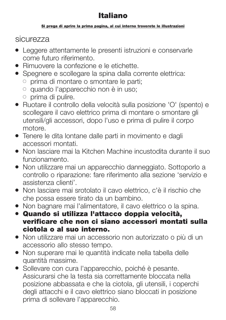 Leggere attentamente le presenti istruzioni e conservarle come futuro riferimento. Rimuovere la confezione e le etichette. Spegnere e scollegare la spina dalla corrente elettrica: l prima di montare o smontare le parti; l quando l'apparecchio non è in uso; l prima di pulire. Ruotare il controllo della velocità sulla posizione 'O' (spento) e scollegare il cavo elettrico prima di montare o smontare gli utensili/gli accessori, dopo l'uso e prima di pulire il corpo motore. Tenere le dita lontane dalle parti in movimento e dagli accessori montati. Non lasciare mai la Kitchen Machine incustodita durante il suo funzionamento. Non utilizzare mai un apparecchio danneggiato. Sottoporlo a controllo o riparazione: fare riferimento alla sezione ‘servizio e assistenza clienti’. Non lasciare mai srotolato il cavo elettrico, c'è il rischio che che possa essere tirato da un bambino. Non bagnare mai l'alimentatore, il cavo elettrico o la spina. Quando si utilizza l'attacco doppia velocità, verificare che non ci siano accessori montati sulla ciotola o al suo interno. Non utilizzare mai un accessorio non autorizzato o più di un accessorio allo stesso tempo. Non superare mai le quantità indicate nella tabella delle quantità massime. Sollevare con cura l'apparecchio, poiché è pesante. Assicurarsi che la testa sia correttamente bloccata nella posizione abbassata e che la ciotola, gli utensili, i coperchi degli attacchi e il cavo elettrico siano bloccati in posizione prima di sollevare l'apparecchio.