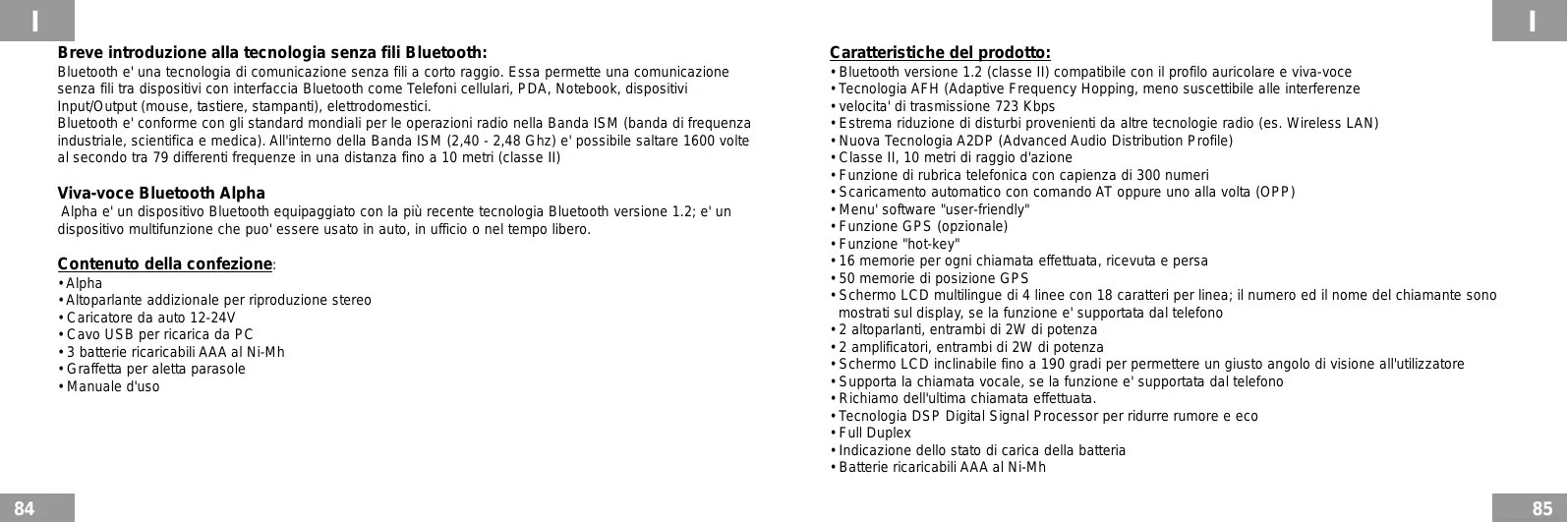 - Batterie ricaricabili AAA al Ni-Mh Viva-voce Bluetooth Alpha Alpha e' un dispositivo Bluetooth equipaggiato con la più recente tecnologia Bluetooth versione 1.2; e' un dispositivo multifunzione che puo' essere usato in auto, in ufficio o nel tempo libero. Contenuto della confezione: