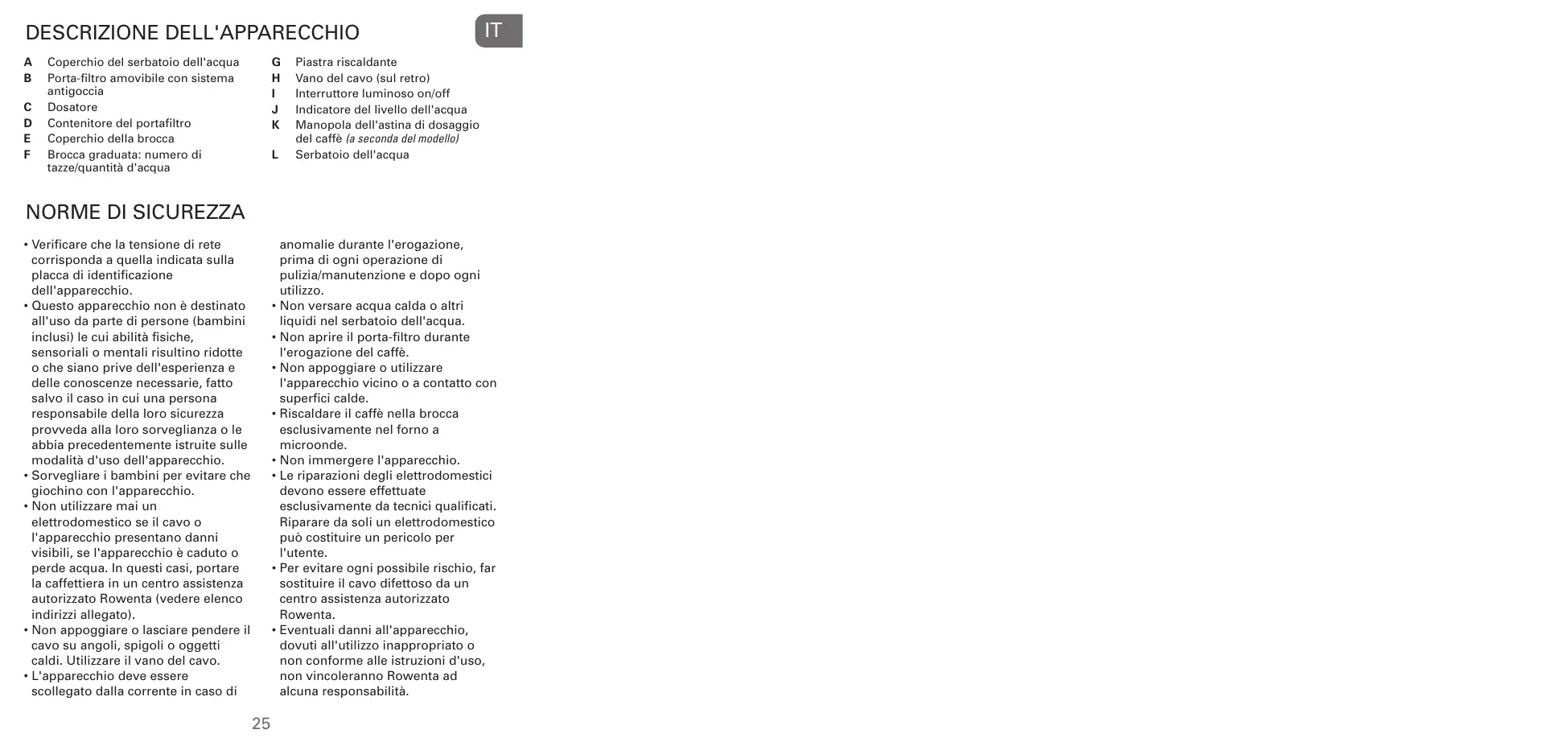 NORME DI SICUREZZA anomalie durante l'erogazione, prima di ogni operazione di pulizia/manutenzione e dopo ogni utilizzo. • Non versare acqua calda o altri liquidi nel serbatoio dell'acqua. • Non aprire il porta-filtro durante l'erogazione del caffè. • Non appoggiare o utilizzare l'apparecchio vicino o a contatto con superfici calde. • Riscaldare il caffè nella brocca esclusivamente nel forno a microonde. • Non immergere l'apparecchio. • Le riparazioni degli elettrodomestici devono essere effettuate esclusivamente da tecnici qualificati. Riparare da soli un elettrodomestico può costituire un pericolo per l'utente. • Per evitare ogni possibile rischio, far sostituire il cavo difettoso da un centro assistenza autorizzato Rowenta. • Eventuali danni all'apparecchio, dovuti all'utilizzo inappropriato o non conforme alle istruzioni d'uso, non vincoleranno Rowenta ad alcuna responsabilità.