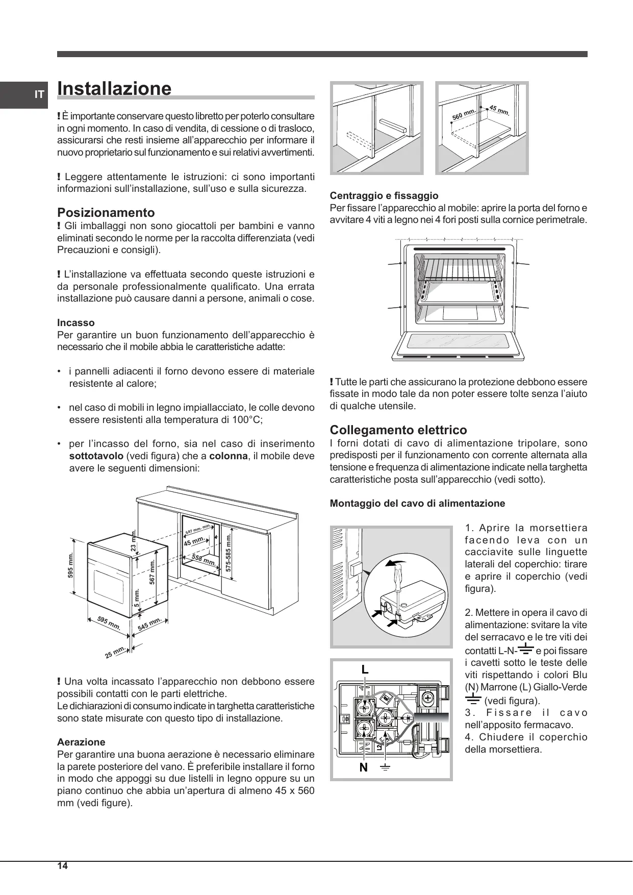 ! Una volta incassato l’apparecchio non debbono essere possibili contatti con le parti elettriche. Le dichiarazioni di consumo indicate in targhetta caratteristiche sono state misurate con questo tipo di installazione. Aerazione Per garantire una buona aerazione è necessario eliminare la parete posteriore del vano. È preferibile installare il forno in modo che appoggi su due listelli in legno oppure su un piano continuo che abbia un’apertura di almeno 45 x 560 mm (vedi figure).