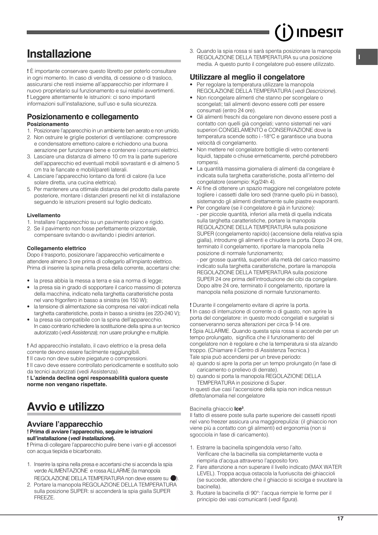 Installazione ! È importante conservare questo libretto per poterlo consultare in ogni momento. In caso di vendita, di cessione o di trasloco, assicurarsi che resti insieme all’apparecchio per informare il nuovo proprietario sul funzionamento e sui relativi avvertimenti. ! Leggere attentamente le istruzioni: ci sono importanti informazioni sull’installazione, sull’uso e sulla sicurezza.