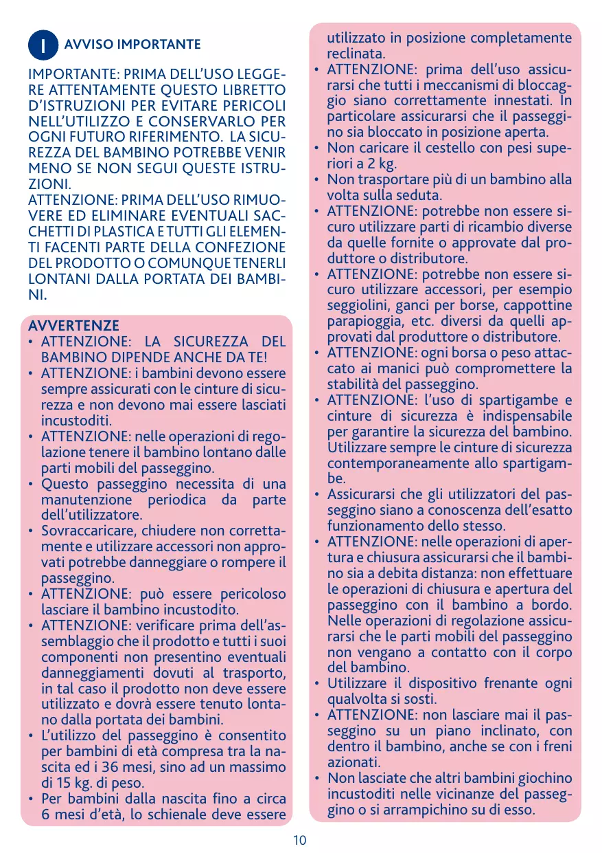 AVVERTENZE • ATTENZIONE: LA SICUREZZA DEL BAMBINO DIPENDE ANCHE DA TE! • ATTENZIONE: i bambini devono essere sempre assicurati con le cinture di sicurezza e non devono mai essere lasciati incustoditi. • ATTENZIONE: nelle operazioni di regolazione tenere il bambino lontano dalle parti mobili del passeggino. • Questo passeggino necessita di una manutenzione periodica da parte dell’utilizzatore. • Sovraccaricare, chiudere non correttamente e utilizzare accessori non approvati potrebbe danneggiare o rompere il passeggino. • ATTENZIONE: può essere pericoloso lasciare il bambino incustodito. • ATTENZIONE: verificare prima dell’assemblaggio che il prodotto e tutti i suoi componenti non presentino eventuali danneggiamenti dovuti al trasporto, in tal caso il prodotto non deve essere utilizzato e dovrà essere tenuto lontano dalla portata dei bambini. • L’utilizzo del passeggino è consentito per bambini di età compresa tra la nascita ed i 36 mesi, sino ad un massimo di 15 kg. di peso. • Per bambini dalla nascita fino a circa 6 mesi d’età, lo schienale deve essere