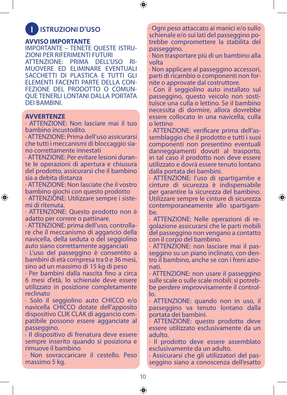 AVVISO IMPORTANTE IMPORTANTE – TENETE QUESTE ISTRUZIONI PER RIFERIMENTI FUTURI ATTENZIONE: PRIMA DELL’USO RIMUOVERE ED ELIMINARE EVENTUALI SACCHETTI DI PLASTICA E TUTTI GLI ELEMENTI FACENTI PARTE DELLA CONFEZIONE DEL PRODOTTO O COMUNQUE TENERLI LONTANI DALLA PORTATA DEI BAMBINI. AVVERTENZE · ATTENZIONE: Non lasciare mai il tuo bambino incustodito. · ATTENZIONE: Prima dell’uso assicurarsi che tutti i meccanismi di bloccaggio siano correttamente innestati · ATTENZIONE: Per evitare lesioni durante le operazioni di apertura e chiusura del prodotto, assicurarsi che il bambino sia a debita distanza · ATTENZIONE: Non lasciate che il vostro bambino giochi con questo prodotto · ATTENZIONE: Utilizzare sempre i sistemi di ritenuta. · ATTENZIONE: Questo prodotto non è adatto per correre o pattinare. · ATTENZIONE: prima dell’uso, controllare che il meccanismo di aggancio della navicella, della seduta o del seggiolino auto siano correttamente agganciati · L’uso del passeggino è consentito a bambini di età compresa tra 0 e 36 mesi, sino ad un massimo di 15 kg di peso · Per bambini dalla nascita fino a circa 6 mesi d’età, lo schienale deve essere utilizzato in posizione completamente reclinato · Solo il seggiolino auto CHICCO e/o navicella CHICCO dotate dell’apposito dispositivo CLIK CLAK di aggancio compatibile possono essere agganciate al passeggino. · Il dispositivo di frenatura deve essere sempre inserito quando si posiziona e rimuove il bambino · Non sovraccaricare il cestello. Peso massimo 5 kg. 10