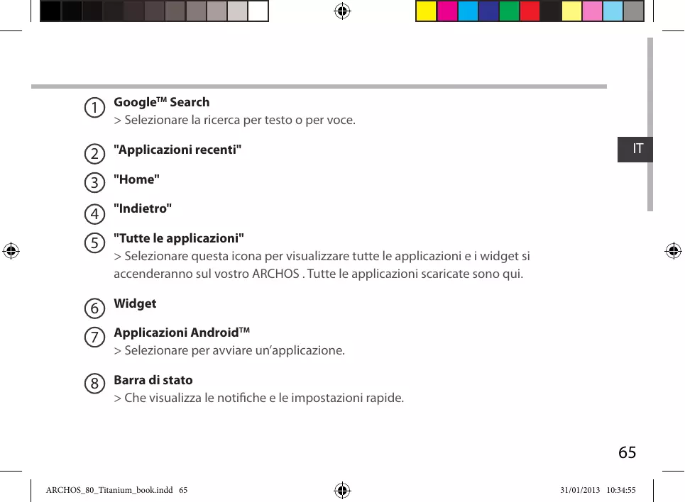 ARCHOS_80_Titanium_book.indd 67 31/01/2013 10:34:56 Conoscere AndroidTM Schermata iniziale estesa: Navigare tra i vari pannelli della schermata iniziale sfiorando da sinistra o destra. Spostare una voce della schermata iniziale: Selezionare e tenere il dito su di essa fino a quando si visualizzano le linee della griglia di posizionamento, quindi scorrere nella posizione desiderata e togliere il dito. Rimuovere una voce della schermata iniziale: Selezionare e tenerla, scorrere il dito verso la parte superiore dello schermo e lasciare sull’icona "Rimuovi". Disinstallare una voce: Dalle schermate "Tutte le applicazioni", selezionare e tenere, scorrere il dito verso la parte superiore dello schermo e lasciare su Cestino disinstalla. Creare cartelle di applicazioni: Lasciare un’icona di applicazione su un’altra icona della schermata iniziale e le due icone si combineranno.