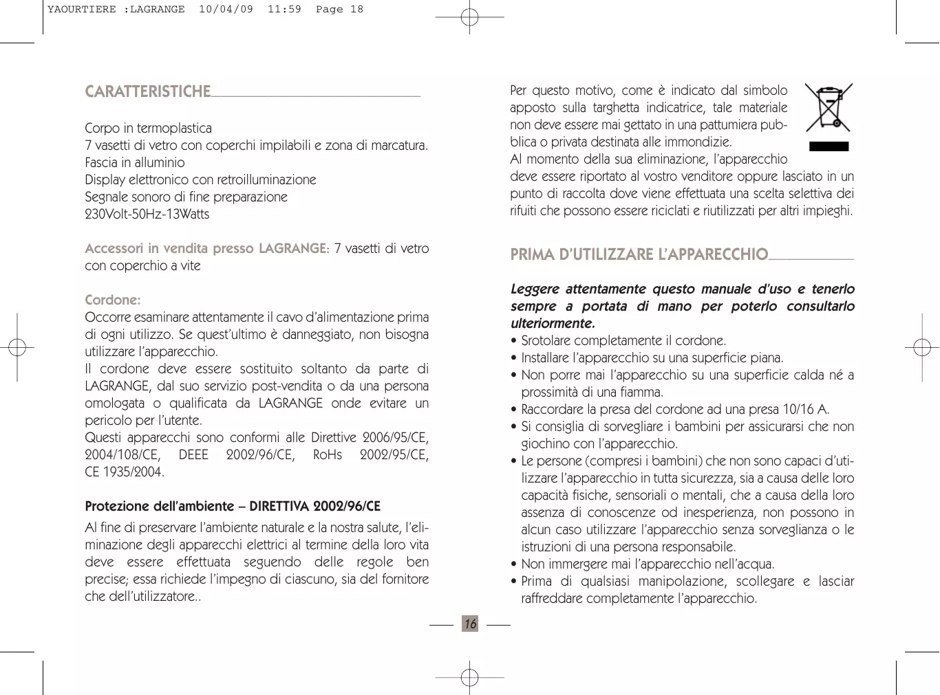 - Prima di qualsiasi manipolazione, scollegare e lasciar raffreddare completamente l’apparecchio. Cordone: Occorre esaminare attentamente il cavo d’alimentazione prima di ogni utilizzo. Se quest’ultimo è danneggiato, non bisogna utilizzare l’apparecchio. Il cordone deve essere sostituito soltanto da parte di LAGRANGE, dal suo servizio post-vendita o da una persona omologata o qualificata da LAGRANGE onde evitare un pericolo per l’utente. Questi apparecchi sono conformi alle Direttive 2006/95/CE, 2004/108/CE, DEEE 2002/96/CE, RoHs 2002/95/CE, CE 1935/2004. Protezione dell’ambiente – DIRETTIVA 2002/96/CE Al fine di preservare l’ambiente naturale e la nostra salute, l’eliminazione degli apparecchi elettrici al termine della loro vita deve essere effettuata seguendo delle regole ben precise; essa richiede l’impegno di ciascuno, sia del fornitore che dell’utilizzatore..