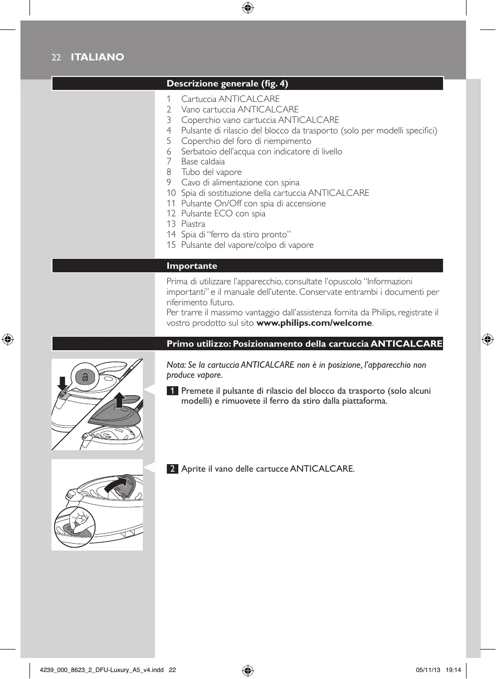 émet des bips, vous pouvez poursuivre le repassage pendant 15 à 30 minutes (en fonction de la dureté de l’eau utilisée). Toutefois, le débit de vapeur diminue progressivement jusqu’à ce que la centrale vapeur ne produise plus du tout de vapeur, et ce pour empêcher la formation de dépôts de calcaire qui endommageraient définitivement votre appareil. -- Pour que l’appareil génère à nouveau de la vapeur, vous devez remplacer la cartouche anticalcaire. Si vous ne voulez pas remplacer la cartouche, utilisez de l’eau déminéralisée ou traitée par IronCare. Dans ce cas, vous devez laisser la cartouche usagée dans le compartiment. Remplacement de la cartouche anticalcaire 1 Éteignez l’appareil et laissez-le refroidir. 2 Suivez les étapes décrites dans le chapitre « Avant la première utilisation - Mise en place de la cartouche anticalcaire ».