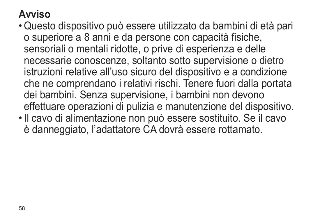 Avviso • Questo dispositivo può essere utilizzato da bambini di età pari o superiore a 8 anni e da persone con capacità fisiche, sensoriali o mentali ridotte, o prive di esperienza e delle necessarie conoscenze, soltanto sotto supervisione o dietro istruzioni relative all’uso sicuro del dispositivo e a condizione che ne comprendano i relativi rischi. Tenere fuori dalla portata dei bambini. Senza supervisione, i bambini non devono effettuare operazioni di pulizia e manutenzione del dispositivo. • Il cavo di alimentazione non può essere sostituito. Se il cavo è danneggiato, l’adattatore CA dovrà essere rottamato.