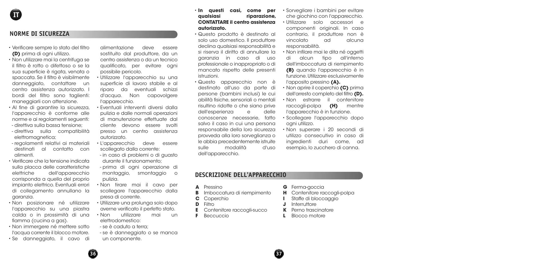 • Non spingere il pressino (A) in modo eccessivo. Evitare di utilizzare altri utensili. In ogni caso, non utilizzare MAI le dita. preparazione ultimata, spegnere l'apparecchio portando l'interruttore (J) su 0 e attendere l'arresto completo del filtro (D).
