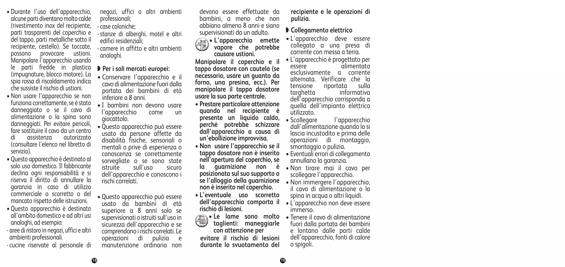- Questo apparecchio può essere usato da bambini di età superiore a 8 anni solo se supervisionati o istruiti sull’uso in sicurezza dell’apparecchio e se comprendono i rischi correlati. Le operazioni di pulizia e manutenzione ordinaria non