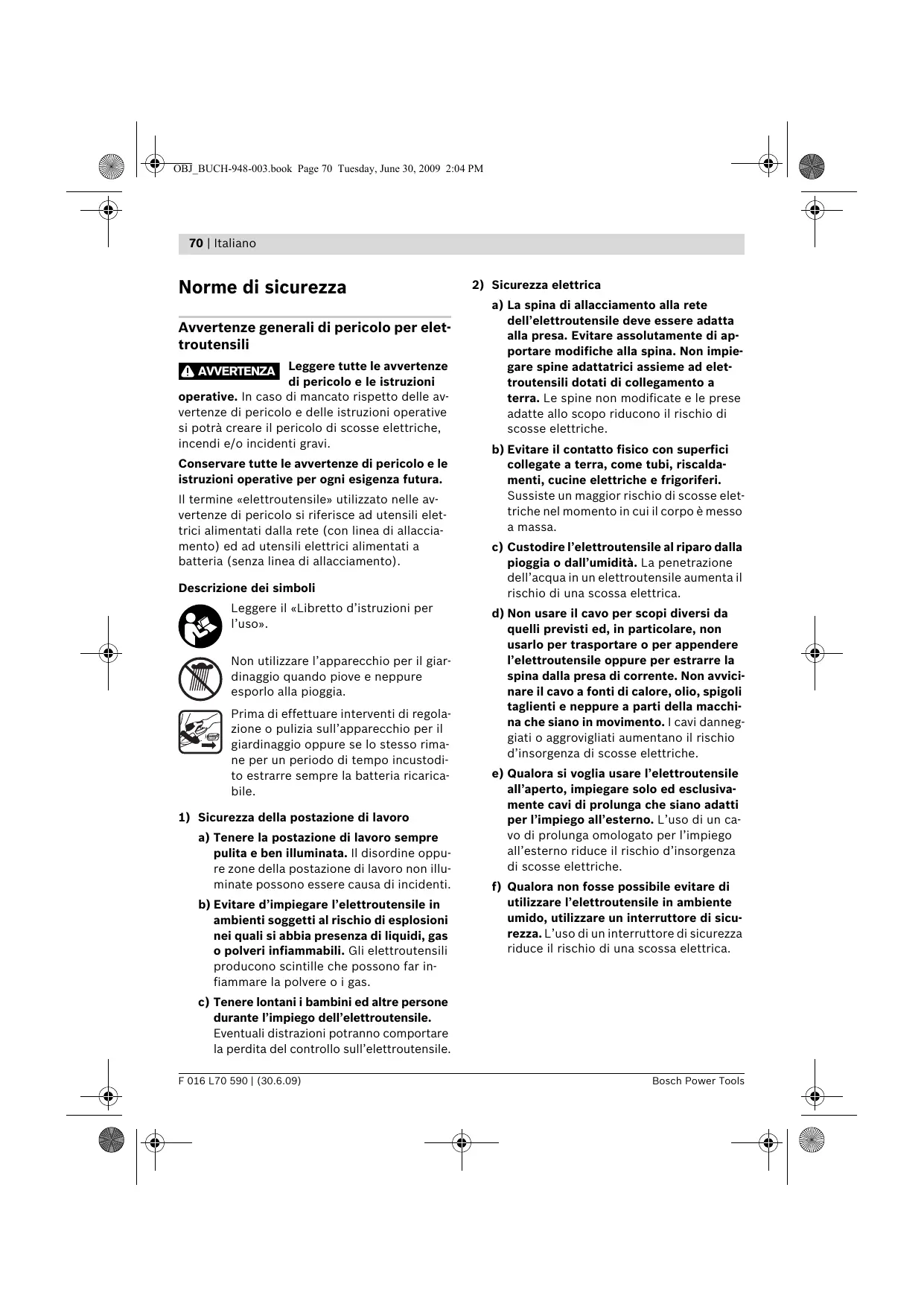 a) La spina di allacciamento alla rete dell’elettroutensile deve essere adatta alla presa. Evitare assolutamente di apportare modifiche alla spina. Non impiegare spine adattatrici assieme ad elettroutensili dotati di collegamento a terra. Le spine non modificate e le prese adatte allo scopo riducono il rischio di scosse elettriche. b) Evitare il contatto fisico con superfici collegate a terra, come tubi, riscaldamenti, cucine elettriche e frigoriferi. Sussiste un maggior rischio di scosse elettriche nel momento in cui il corpo è messo a massa. c) Custodire l’elettroutensile al riparo dalla pioggia o dall’umidità. La penetrazione dell’acqua in un elettroutensile aumenta il rischio di una scossa elettrica. d) Non usare il cavo per scopi diversi da quelli previsti ed, in particolare, non usarlo per trasportare o per appendere l’elettroutensile oppure per estrarre la spina dalla presa di corrente. Non avvicinare il cavo a fonti di calore, olio, spigoli taglienti e neppure a parti della macchina che siano in movimento. I cavi danneggiati o aggrovigliati aumentano il rischio d’insorgenza di scosse elettriche. e) Qualora si voglia usare l’elettroutensile all’aperto, impiegare solo ed esclusivamente cavi di prolunga che siano adatti per l’impiego all’esterno. L’uso di un cavo di prolunga omologato per l’impiego all’esterno riduce il rischio d’insorgenza di scosse elettriche. f) Qualora non fosse possibile evitare di utilizzare l’elettroutensile in ambiente umido, utilizzare un interruttore di sicurezza. L’uso di un interruttore di sicurezza riduce il rischio di una scossa elettrica. c) Tenere lontani i bambini ed altre persone durante l’impiego dell’elettroutensile. Eventuali distrazioni potranno comportare la perdita del controllo sull’elettroutensile. F 016 L70 590 | (30.6.09) Bosch Power Tools OBJ_BUCH-948-003.book Page 71 Tuesday, June 30, 2009 2:04 PM Italiano | 71