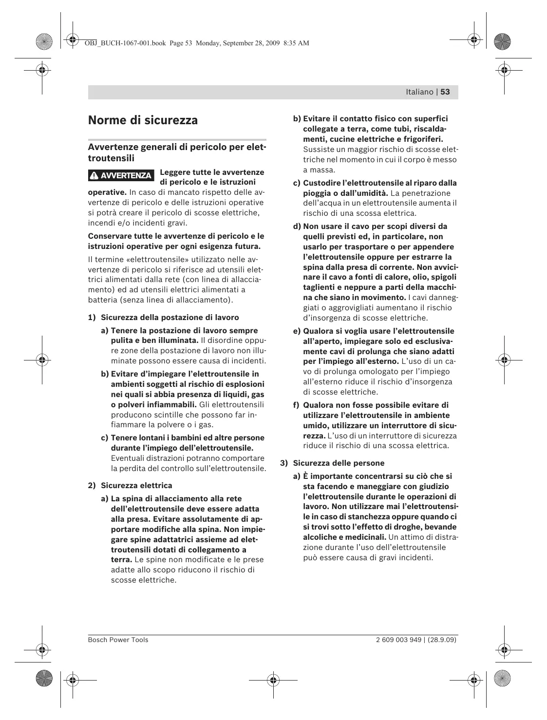 OBJ_BUCH-1067-001.book Page 55 Monday, September 28, 2009 8:35 AM Italiano | 55 g) Utilizzare l’elettroutensile, gli accessori opzionali, gli utensili per applicazioni specifiche ecc., sempre attenendosi alle presenti istruzioni. Così facendo, tenere sempre presente le condizioni di lavoro e le operazioni da eseguire. L’impiego di elettroutensili per usi diversi da quelli consentiti potrà dar luogo a situazioni di pericolo. 5) Assistenza a) Fare riparare l’elettroutensile solo ed esclusivamente da personale specializzato e solo impiegando pezzi di ricambio originali. In tale maniera potrà essere salvaguardata la sicurezza dell’elettroutensile.