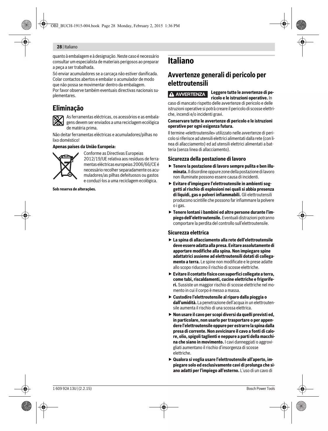Manutenção e limpeza Manter a ferramenta eléctrica e as aberturas de ventilação sempre limpas, para trabalhar bem e de forma segura. Serviço pós-venda e consultoria de aplicação O serviço pós-venda responde às suas perguntas a respeito de serviços de reparação e de manutenção do seu produto, assim como das peças sobressalentes. Desenhos explodidos e informações sobre peças sobressalentes encontram-se em: www.bosch-pt.com A nossa equipa de consultoria de aplicação Bosch esclarecem com prazer todas as suas dúvidas a respeito da compra, aplicação e ajuste dos produtos e acessórios. Para todas as questões e encomendas de peças sobressalentas é imprescindível indicar o número de produto de 10 dígitos como consta na placa de características da ferramenta eléctrica. Portugal Robert Bosch LDA Avenida Infante D. Henrique Lotes 2E – 3E 1800 Lisboa Para efectuar o seu pedido online de peças entre na página www.ferramentasbosch.com. Tel.: 21 8500000 Fax: 21 8511096 Brasil Robert Bosch Ltda. Caixa postal 1195 13065-900 Campinas Tel.: (0800) 7045446 www.bosch.com.br/contacto Transporte Os acumuladores de iões de lítio, contidos, estão sujeitos ao direito de materiais perigosos. Os acumuladores podem ser transportados na rua pelo utilizador, sem mais obrigações. Na expedição por terceiros (por ex.: transporte aéreo ou expedição), devem ser observadas as especiais exigências 1 609 92A 13U | (2.2.15) OBJ_BUCH-1915-004.book Page 28 Monday, February 2, 2015 1:36 PM 28 | Italiano quanto à embalagem e à designação. Neste caso é necessário consultar um especialista de materiais perigosos ao preparar a peça a ser trabalhada. Só enviar acumuladores se a carcaça não estiver danificada. Colar contactos abertos e embalar o acumulador de modo que não possa se movimentar dentro da embalagem. Por favor observe também eventuais directivas nacionais suplementares. Eliminação As ferramentas eléctricas, os acessórios e as embalagens devem ser enviados a uma reciclagem ecológica de matéria prima. Não deitar ferramentas eléctricas e acumuladores/pilhas no lixo doméstico! Apenas países da União Europeia: Conforme as Directivas Europeias 2012/19/UE relativa aos resíduos de ferramentas eléctricas europeias 2006/66/CE é necessário recolher separadamente os acumuladores/as pilhas defeituosos ou gastos e conduzí-los a uma reciclagem ecológica. Sob reserva de alterações. Italiano Avvertenze generali di pericolo per elettroutensili Leggere tutte le avvertenze di pericolo e le istruzioni operative. In caso di mancato rispetto delle avvertenze di pericolo e delle istruzioni operative si potrà creare il pericolo di scosse elettriche, incendi e/o incidenti gravi. Conservare tutte le avvertenze di pericolo e le istruzioni operative per ogni esigenza futura. Il termine «elettroutensile» utilizzato nelle avvertenze di pericolo si riferisce ad utensili elettrici alimentati dalla rete (con linea di allacciamento) ed ad utensili elettrici alimentati a batteria (senza linea di allacciamento). AVVERTENZA Sicurezza della postazione di lavoro Tenere la postazione di lavoro sempre pulita e ben illuminata. Il disordine oppure zone della postazione di lavoro non illuminate possono essere causa di incidenti. Evitare d’impiegare l’elettroutensile in ambienti soggetti al rischio di esplosioni nei quali si abbia presenza di liquidi, gas o polveri infiammabili. Gli elettroutensili producono scintille che possono far infiammare la polvere o i gas. Tenere lontani i bambini ed altre persone durante l’impiego dell’elettroutensile. Eventuali distrazioni potranno comportare la perdita del controllo sull’elettroutensile. Sicurezza elettrica La spina di allacciamento alla rete dell’elettroutensile deve essere adatta alla presa. Evitare assolutamente di apportare modifiche alla spina. Non impiegare spine adattatrici assieme ad elettroutensili dotati di collegamento a terra. Le spine non modificate e le prese adatte allo scopo riducono il rischio di scosse elettriche. Evitare il contatto fisico con superfici collegate a terra, come tubi, riscaldamenti, cucine elettriche e frigoriferi. Sussiste un maggior rischio di scosse elettriche nel momento in cui il corpo è messo a massa. Custodire l’elettroutensile al riparo dalla pioggia o dall’umidità. La penetrazione dell’acqua in un elettroutensile aumenta il rischio di una scossa elettrica. Non usare il cavo per scopi diversi da quelli previsti ed, in particolare, non usarlo per trasportare o per appendere l’elettroutensile oppure per estrarre la spina dalla presa di corrente. Non avvicinare il cavo a fonti di calore, olio, spigoli taglienti e neppure a parti della macchina che siano in movimento. I cavi danneggiati o aggrovigliati aumentano il rischio d’insorgenza di scosse elettriche. Qualora si voglia usare l’elettroutensile all’aperto, impiegare solo ed esclusivamente cavi di prolunga che siano adatti per l’impiego all’esterno. L’uso di un cavo di 1 609 92A 13U | (2.2.15) Bosch Power Tools OBJ_BUCH-1915-004.book Page 29 Monday, February 2, 2015 1:36 PM Italiano | 29 prolunga omologato per l’impiego all’esterno riduce il rischio d’insorgenza di scosse elettriche. Qualora non fosse possibile evitare di utilizzare l’elettroutensile in ambiente umido, utilizzare un interruttore di sicurezza. L’uso di un interruttore di sicurezza riduce il rischio di una scossa elettrica. Sicurezza delle persone È importante concentrarsi su ciò che si sta facendo e maneggiare con giudizio l’elettroutensile durante le operazioni di lavoro. Non utilizzare mai l’elettroutensile in caso di stanchezza oppure quando ci si trovi sotto l’effetto di droghe, bevande alcoliche e medicinali. Un attimo di distrazione durante l’uso dell’elettroutensile può essere causa di gravi incidenti. Indossare sempre equipaggiamento protettivo individuale nonché occhiali protettivi. Indossando abbigliamento di protezione 