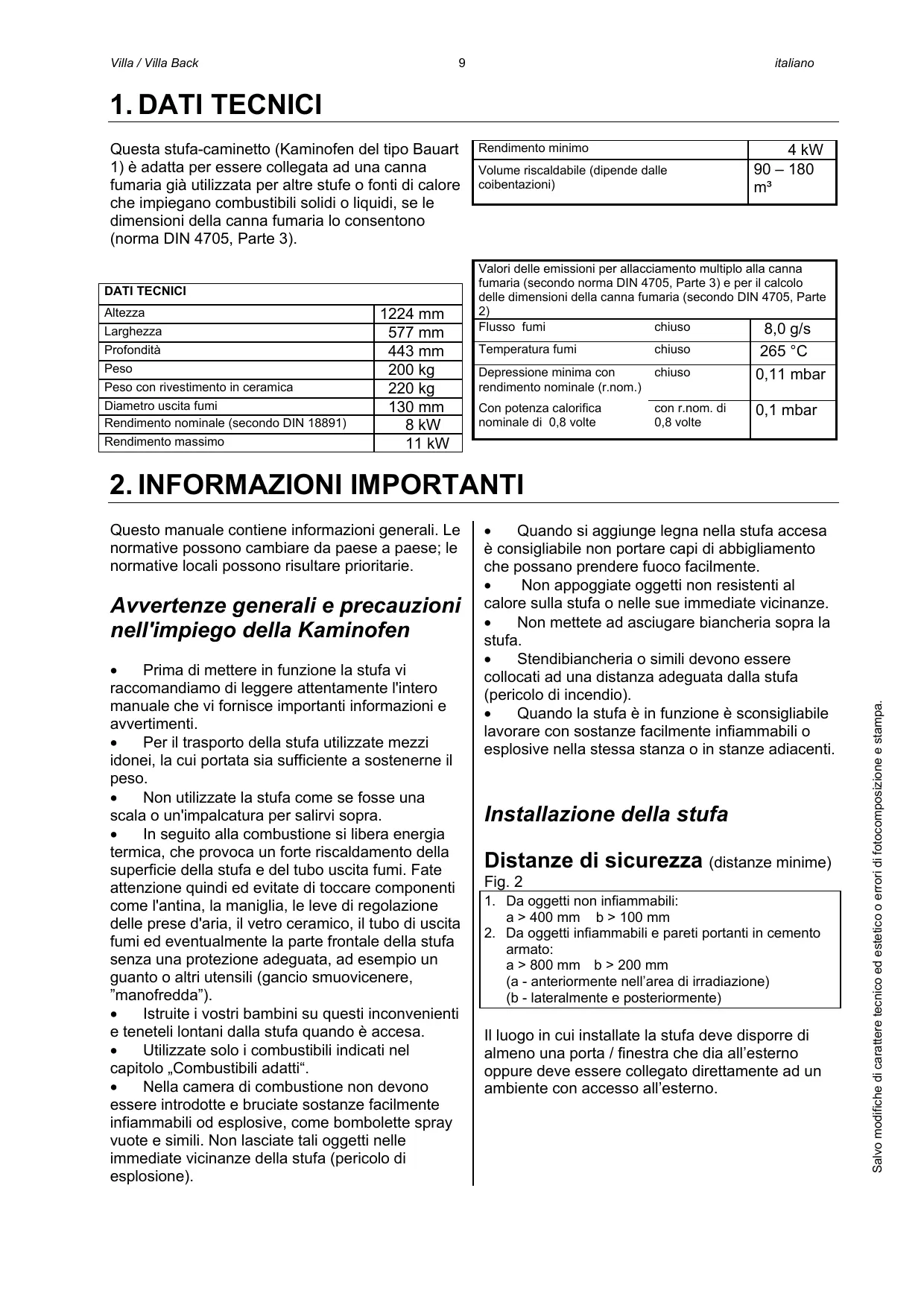 Portata del pavimento Prima di installare la stufa, accertatevi che la struttura sottostante al punto in cui volete sistemarla sia in grado di sopportarne il peso. Villa / Villa Back Collegamento del tubo di uscita fumi Per garantire la vostra sicurezza, il collegamento dei tubi di uscita fumi alla canna fumaria è regolato da apposite norme. Per l’installazione e il collegamento rivolgetevi quindi al vostro rivenditore, che è a conoscenza di tali disposizioni.