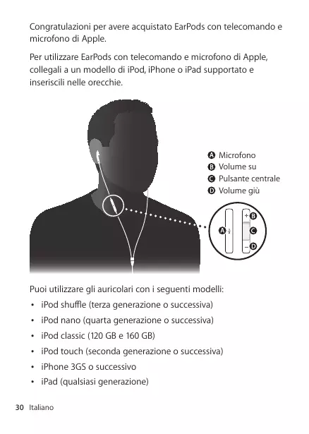 Scarica le istruzioni per il tuo Accessori audio in formato PDF gratuitamente! Trova il tuo manuale EARPODS - APPLE e riprendi in mano il tuo dispositivo elettronico. In questa pagina sono pubblicati tutti i documenti necessari per l'utilizzo del tuo dispositivo. EARPODS del marchio APPLE.