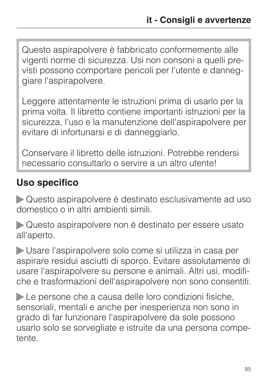 Le personne che a causa delle loro condizioni fisiche, sensoriali, mentali eanche per inesperienza non sono in grado di far funzionare l'aspirapolvere da sole possono uso lo solo se sorvegliate e istruite da una persona competente.