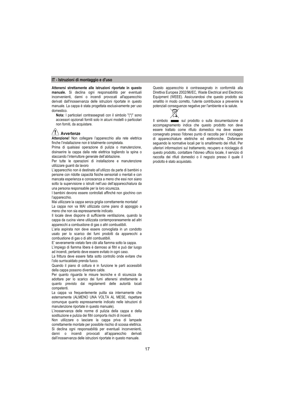 IT - Istruzioni di montaggio e d'uso Questo apparecchio è contrassegnato in conformità alla Direttiva Europea 2002/96/EC, Waste Electrical and Electronic Equipment (WEEE). Assicurandosi che questo prodotto sia smaltito in modo corretto, l'utente contribuisce a prevenire le potenziali conseguenze negative per l'ambiente e la salute. Attenersi strettamente alle istruzioni riportate in questo manuale. Si declina ogni responsabilità per eventuali inconvenienti, danni o incendi provocati all'apparecchio derivati dall'inosservanza delle istruzioni riportate in questo manuale. La cappa è stata progettata esclusivamente per uso domestico. Nota: I particolari contrassegnati con il simbolo "(*)" sono accessori opzionali forniti solo in alcuni modelli o particolari non forniti, da acquistare. Il simbolo sul prodotto o sulla documentazione di accompagnamento indica che questo prodotto non deve essere trattato come rifiuto domestico ma deve essere consegnato presso l'idoneo punto di raccolta per il riciclaggio di apparecchiature elettriche ed elettroniche. Disfarsene seguendo le normative locali per lo smaltimento dei rifiuti. Per ulteriori informazioni sul trattamento, recupero e riciclaggio di questo prodotto, contattare l'idoneo ufficio locale, il servizio di raccolta dei rifiuti domestici o il negozio presso il quale il prodotto è stato acquistato. Avvertenze Attenzione! Non collegare l’apparecchio alla rete elettrica finche l’installazione non è totalmente completata. Prima di qualsiasi operazione di pulizia o manutenzione, disinserire la cappa dalla rete elettrica togliendo la spina o staccando l’interruttore generale dell’abitazione. Per tutte le operazioni di installazione e manutenzione utilizzare guanti da lavoro L’apparecchio non è destinato all’utilizzo da parte di bambini o persone con ridotte capacità fisiche sensoriali o mentali e con mancata esperienza e conoscenza a meno che essi non siano sotto la supervisione o istruiti nell’uso dell’apparecchiatura da una persona responsabile per la loro sicurezza. I bambini devono essere controllati affinché non giochino con l’apparecchio. Mai utilizzare la cappa senza griglia correttamente montata! La cappa non va MAI utilizzata come piano di appoggio a meno che non sia espressamente indicato. Il locale deve disporre di sufficiente ventilazione, quando la cappa da cucina viene utilizzata contemporaneamente ad altri apparecchi a combustione di gas o altri combustibili. L’aria aspirata non deve essere convogliata in un condotto usato per lo scarico dei fumi prodotti da apparecchi a combustione di gas o di altri combustibili. E’ severamente vietato fare cibi alla fiamma sotto la cappa. L’impiego di fiamma libera è dannoso ai filtri e può dar luogo ad incendi, pertanto deve essere evitato in ogni caso. La frittura deve essere fatta sotto controllo onde evitare che l’olio surriscaldato prenda fuoco. Quando il piano di cottura è in funzione le parti accessibili della cappa possono diventare calde. Per quanto riguarda le misure tecniche e di sicurezza da adottare per lo scarico dei fumi attenersi strettamente a quanto previsto dai regolamenti delle autorità locali competenti. La cappa va frequentemente pulita sia internamente che esternamente (ALMENO UNA VOLTA AL MESE, rispettare comunque quanto espressamente indicato nelle istruzioni di manutenzione riportate in questo manuale). L’inosservanza delle norme di pulizia della cappa e della sostituzione e pulizia dei filtri comporta rischi di incendi. Non utilizzare o lasciare la cappa priva di lampade correttamente montate per possibile rischio di scossa elettrica. Si declina ogni responsabilità per eventuali inconvenienti, danni o incendi provocati all’apparecchio derivati dall’inosservanza delle istruzioni riportate in questo manuale.