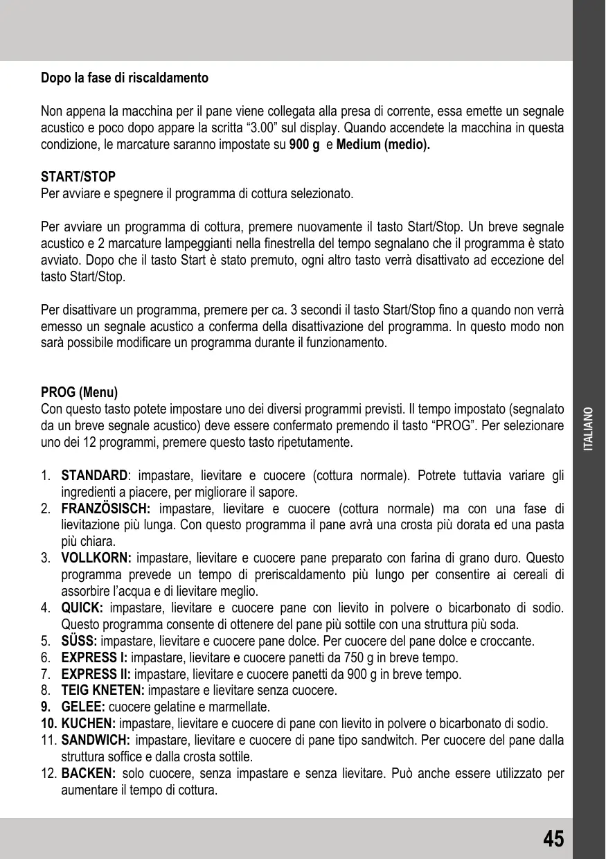- FRANZÖSISCH: impastare, lievitare e cuocere (cottura normale) ma con una fase di lievitatione più lunga. Con quello programma il pane avrà una crosta più dorata ed una pasta più chiara.