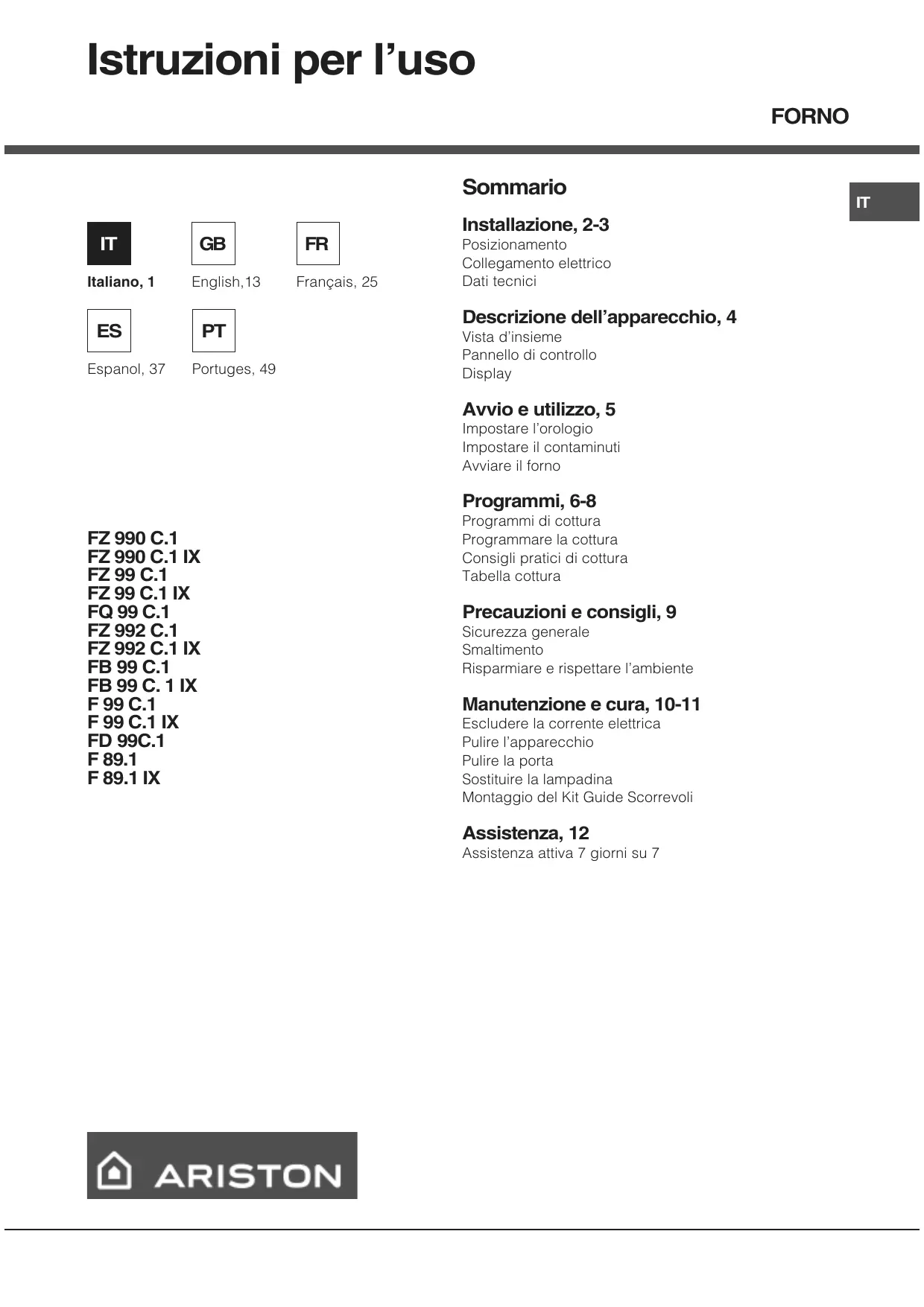 MANUALE UTENTE FQ 99 GP1 FHA ICE HOTPOINT-ARISTON