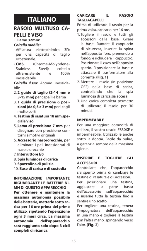 IMPERMEABILE Per una maggiore comodità di utilizzo, il vostro rasoio E830XE è impermeabile. Utilizzabile anche sotto la doccia. Facile da pulire, a garanzia sempre della massima igiene. INSERIRE E TOGLIERE GLI ACCESSORI Controllare che l’apparecchio sia spento prima di cambiare le testine di rasatura e gli accessori. Per posizionare una testina, aggiustare la parte bassa dell’accessorio sull’apparecchio e inserire tutta la testina fino a sentire uno scatto. Per togliere una testina, tenera l’impugnatura dell’apparecchio in una mano e togliere la testina con l’altra mano, spingendo verso l’alto. (Fig. 2)