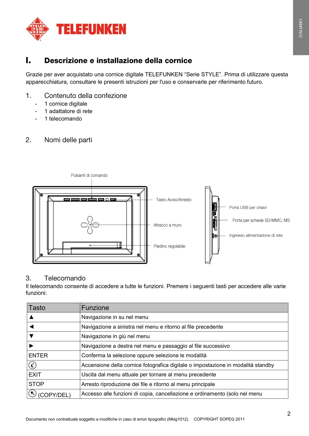 Grazie per aver acquistato una cornice digitale TELEFUNKEN “Serie STYLE”. Prima di utilizzare questa apparecchiatura, consultare le presenti istruzioni per l'uso e conservarle per riferimento futuro.