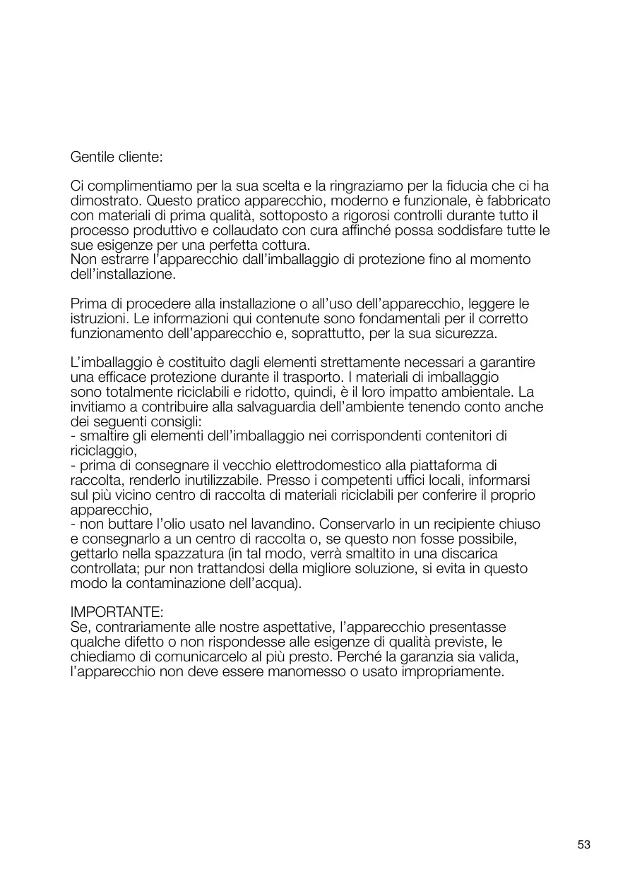 L’emballage de votre appareil a été fabriqué avec les matériaux strictement nécessaires pour garantir une protection efficace pendant le transport. Ces matériels sont entièrement recyclables, ce qui réduit l’impact sur l’environnement. Nous vous encourageons à contribuer également à la conservation de l’environnement, en suivant les conseils ci-dessous : - mettez au rebut l’emballage dans le conteneur de recyclage approprié, - avant de vous défaire d’un appareil usagé, mettez-le hors d’état. Consultez votre administration locale pour connaître l’adresse du centre de collecte de matériels recyclables le plus près de chez vous et apportez-le à ce site, - ne jetez pas l’huile usagée dans l’évier. Conservez-la dans un récipient fermé et remettez-le à un point de collecte ou, le cas échéant, dans un conteneur de poubelle (qui sera remis à un dépotoir contrôlé ; il ne s’agit sans doute pas de la meilleure solution, mais nous évitons la contamination de l’eau). IMPORTANT : Si, contrairement à nos attentes, l’appareil présente un dommage ou ne respecte pas les exigences de qualité prévues, veuillez nous l’indiquer dans les plus brefs délais. Pour que la garantie soit valide, l’appareil ne devra pas avoir été manipulé, ni soumis à une mauvaise utilisation.