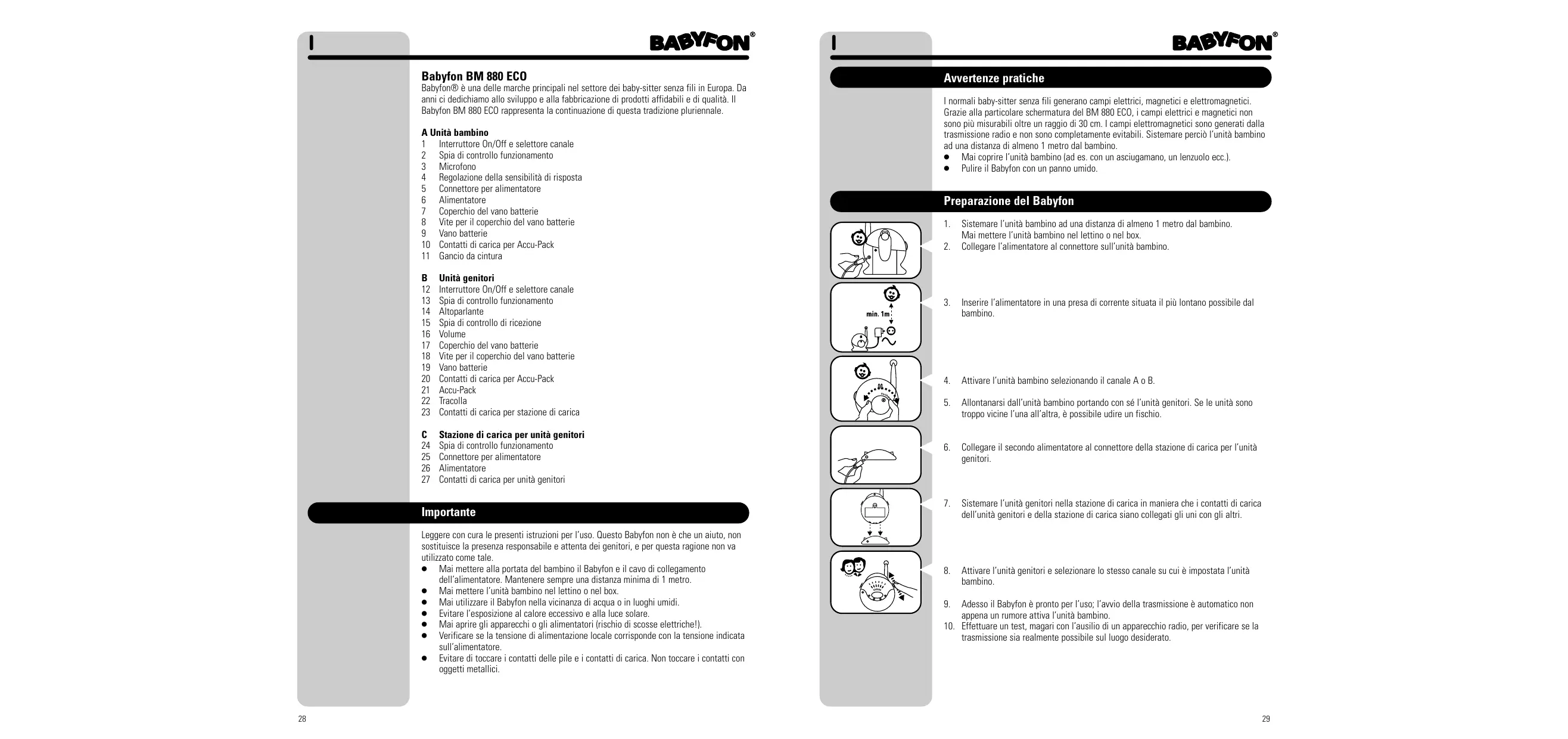 Babyfon BM 880 ECO Avvertenze pratiche Babyfon® è una delle marche principali nel settore dei baby-sitter senza fili in Europa. Da anni ci dedichiamo allo sviluppo e alla fabbricazione di prodotti affidabili e di qualità. Il Babyfon BM 880 ECO rappresenta la continuazione di questa tradizione pluriennale. Leggere con cura le presenti istruzioni per l’uso. Questo Babyfon non è che un aiuto, non sostituisce la presenza responsabile e attenta dei genitori, e per questa ragione non va utilizzato come tale. ● Mai mettere alla portata del bambino il Babyfon e il cavo di collegamento dell’alimentatore. Mantenere sempre una distanza minima di 1 metro. ● Mai mettere l’unità bambino nel lettino o nel box. ● Mai utilizzare il Babyfon nella vicinanza di acqua o in luoghi umidi. ● Evitare l’esposizione al calore eccessivo e alla luce solare. ● Mai aprire gli apparecchi o gli alimentatori (rischio di scosse elettriche!). ● Verificare se la tensione di alimentazione locale corrisponde con la tensione indicata sull’alimentatore. ● Evitare di toccare i contatti delle pile e i contatti di carica. Non toccare i contatti con oggetti metallici.