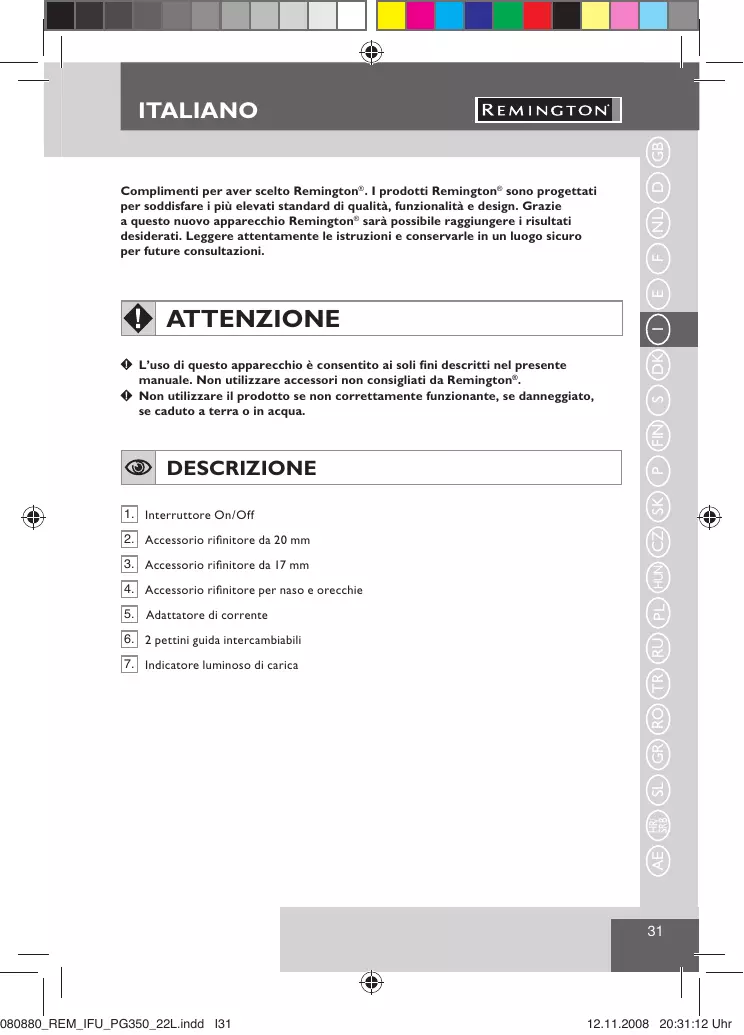 Il prodotto contiene un'unità cellulare di Nickel Metal Idruro. Non gettare il rifinitore tra i rifiuti domestici al termine del ciclo di vita utile. É possible providere allo smaltimento presso il centro di assistenza Remington® più vicò o i punti di raccolta apposti.