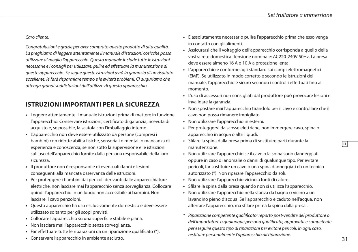 - Riparazione competente qualificato: reparto post-vendite del produttore o dell'importatore o qualunque persona qualificata, approvata e competente per eseguire quello tipo di riparazioni per evitare pericoli. In agli caso, restituire personalmente l'apparecchio all'riparazione.