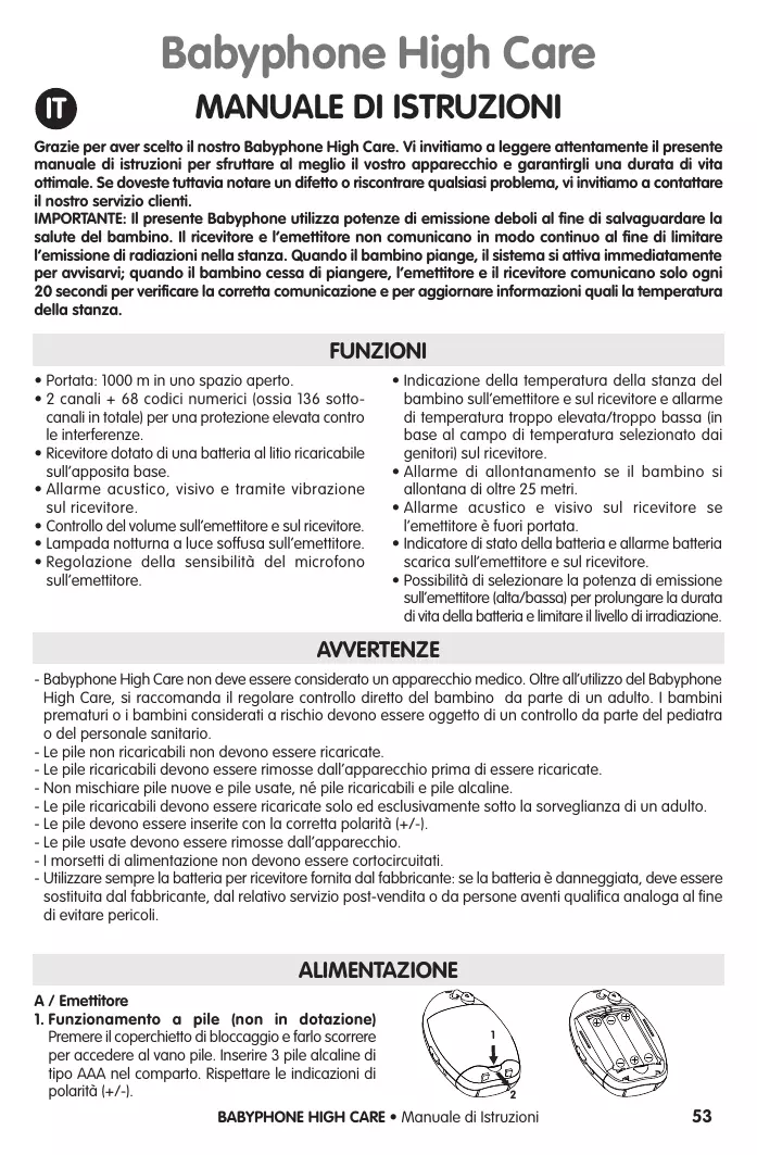 AVVERTENZE - Babyphone High Care non deve essere considerato un apparecchio medico. Oltre all’utilizzo del Babyphone High Care, si raccomanda il regolare controllo diretto del bambino da parte di un adulto. I bambini prematuri o i bambini considerati a rischio devono essere oggetto di un controllo da parte del pediatra o del personale sanitario. - Le pile non ricaricabili non devono essere ricaricate. - Le pile ricaricabili devono essere rimosse dall’apparecchio prima di essere ricaricate. - Non mischiare pile nuove e pile usate, né pile ricaricabili e pile alcaline. - Le pile ricaricabili devono essere ricaricate solo ed esclusivamente sotto la sorveglianza di un adulto. - Le pile devono essere inserite con la corretta polarità (+/-). - Le pile usate devono essere rimosse dall’apparecchio. - I morsetti di alimentazione non devono essere cortocircuitati. - Utilizzare sempre la batteria per ricevitore fornita dal fabbricante: se la batteria è danneggiata, deve essere sostituita dal fabbricante, dal relativo servizio post-vendita o da persone aventi qualifica analoga al fine di evitare pericoli.
