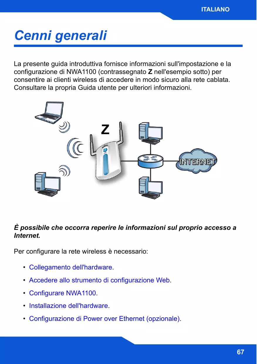 È possibile che occorra reperire le informazioni sul proprio accesso a Internet. Per configurare la rete wireless è necessario: • Collegamento dell'hardware. • Accedere allo strumento di configurazione Web. • Configurare NWA1100. • Installazione dell'hardware. • Configurazione di Power over Ethernet (opzionale).