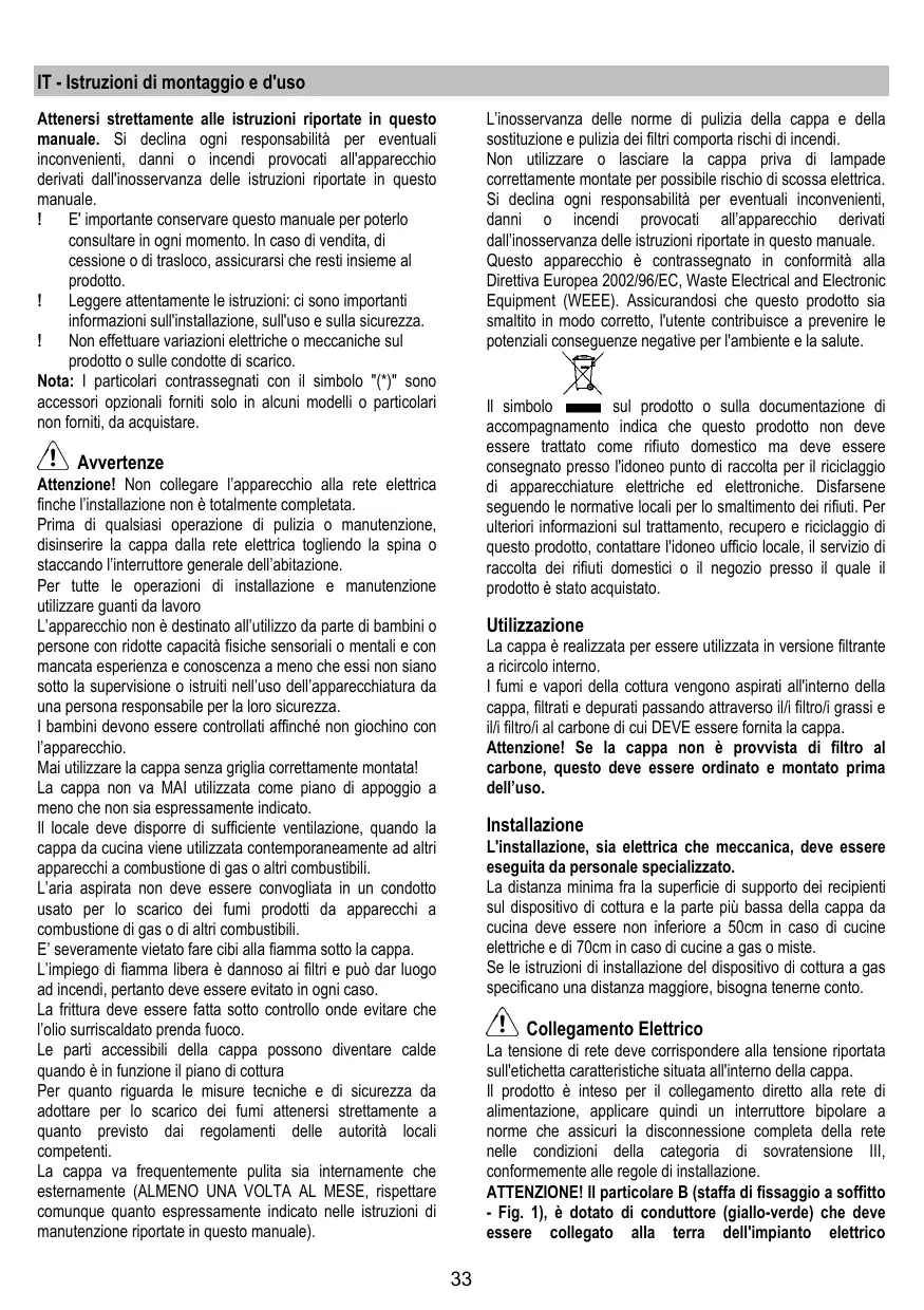 Attenzione! Se la cappa non è provvista di filtering al carbone, quello deve essere ordinato e montato prima dell'uso.