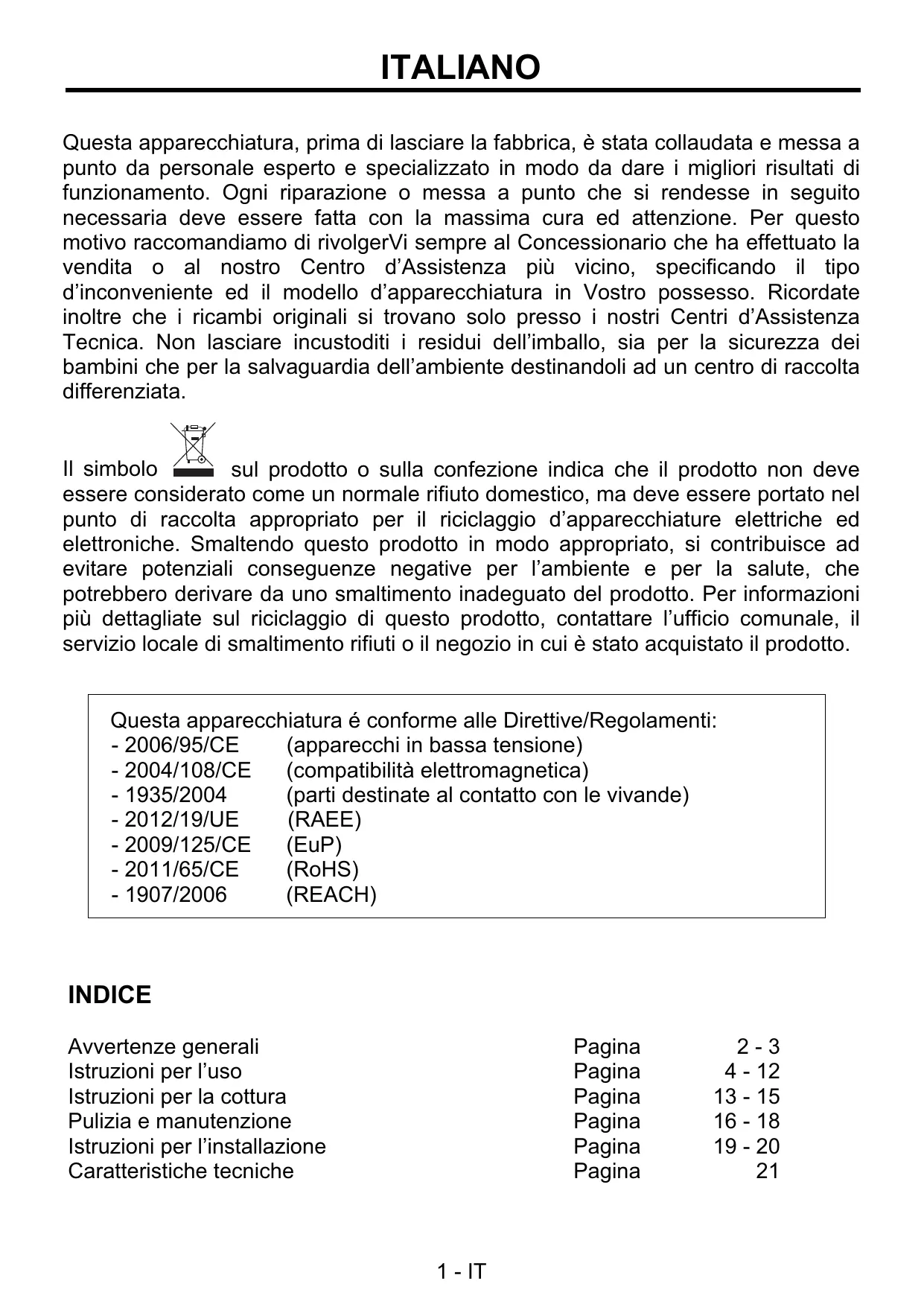 Manual de instruções para Instalação - Uso - Manutenção ITALIANO Questa apparecchiatura, prima di lasciare la fabbrica, è stata collaudata e messa a punto da personale esperto e specializzato in modo da dare i migliori risultati di funzionamento. Ogni riparazione o messa a punto che si rendesse in seguito necessaria deve essere fatta con la massima cura ed attenzione. Per questo motivo raccomandiamo di rivolgerVi sempre al Concessionario che ha effettuato la vendita o al nostro Centro d’Assistenza più vicino, specificando il tipo d’inconveniente ed il modello d’apparecchiatura in Vostro possesso. Ricordate inoltre che i ricambi originali si trovano solo presso i nostri Centri d’Assistenza Tecnica. Non lasciare incustoditi i residui dell’imballo, sia per la sicurezza dei bambini che per la salvaguardia dell’ambiente destinandoli ad un centro di raccolta differenziata. Il simbolo sul prodotto o sulla confezione indica che il prodotto non deve essere considerato come un normale rifiuto domestico, ma deve essere portato nel punto di raccolta appropriato per il riciclaggio d’apparecchiature elettriche ed elettroniche. Smaltendo questo prodotto in modo appropriato, si contribuisce ad evitare potenziali conseguenze negative per l’ambiente e per la salute, che potrebbero derivare da uno smaltimento inadeguato del prodotto. Per informazioni più dettagliate sul riciclaggio di questo prodotto, contattare l’ufficio comunale, il servizio locale di smaltimento rifiuti o il negozio in cui è stato acquistato il prodotto. Questa apparecchiatura é conforme alle Direttive/Regolamenti: - 2006/95/CE (apparecchi in bassa tensione) - 2004/108/CE (compatibilità elettromagnetica) - 1935/2004 (parti destinate al contatto con le vivande) (RAEE) - 2012/19/UE - 2009/125/CE (EuP) - 2011/65/CE (RoHS) - 1907/2006 (REACH) INDICE Avvertenze generali Istruzioni per l’uso Istruzioni per la cottura Pulizia e manutenzione Istruzioni per l’installazione Caratteristiche tecniche Pagina Pagina Pagina Pagina Pagina Pagina