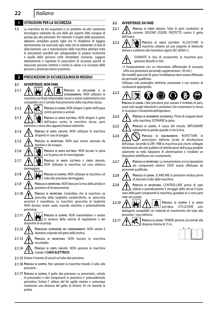 Sur les surfaces verticales, partir du bas vers le haut. Laisser agir pendant 1÷2 minutes, sans laisser sécher la surface. Pulvériser un jet à haute pression à une distance de plus de 30 cm, en commençant par le bas. Éviter que l’eau de rinçage coule sur les surfaces non lavées. Dans certains cas, pour enlever la saleté, l’action mécanique des brosses est nécessaire. La pression élevée n’est pas toujours la meilleure solution pour un bon lavage, car elle peut endommager certaines surfaces. Il est conseillé d’éviter l’utilisation du jet fin de la tête réglable et de la buse rotative sur des parties délicates et peintes et sur des composants sous pression (ex. pneumatiques, valves de gonflage..). Un bon lavage dépend, en mesure égale, de la pression et du volume d’eau.