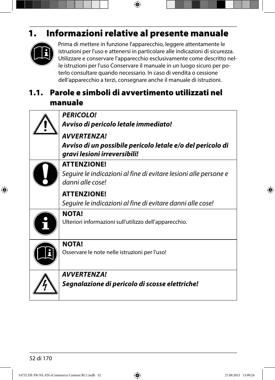 1.1. Parole e simboli di avvertimento utilizzati nel manuale PERICOLO! Avviso di pericolo letale immediato! AVVERTENZA! Avviso di un possibile pericolo letale e/o del pericolo di gravi lesioni irreversibili! ATTENZIONE! Seguire le indicazioni al fine di evitare lesioni alle persone e danni alle cose! ATTENZIONE! Seguire le indicazioni al fine di evitare danni alle cose! NOTA! Ulteriori informazioni sull'utilizzo dell'apparecchio.